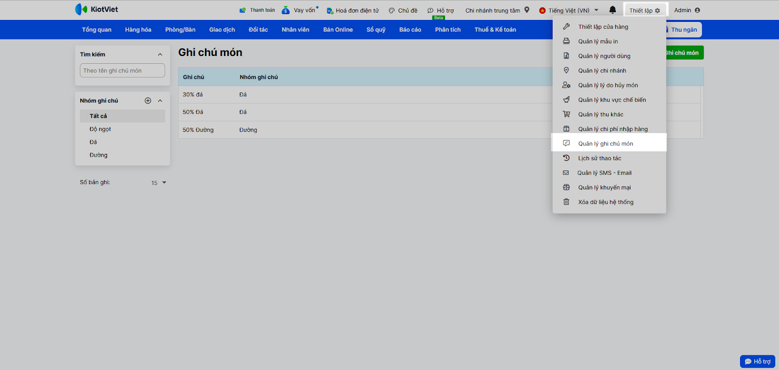 - Tại màn hình Quản lý, từ menu Thiết lập, bạn chọn Quản lý ghi chú món.