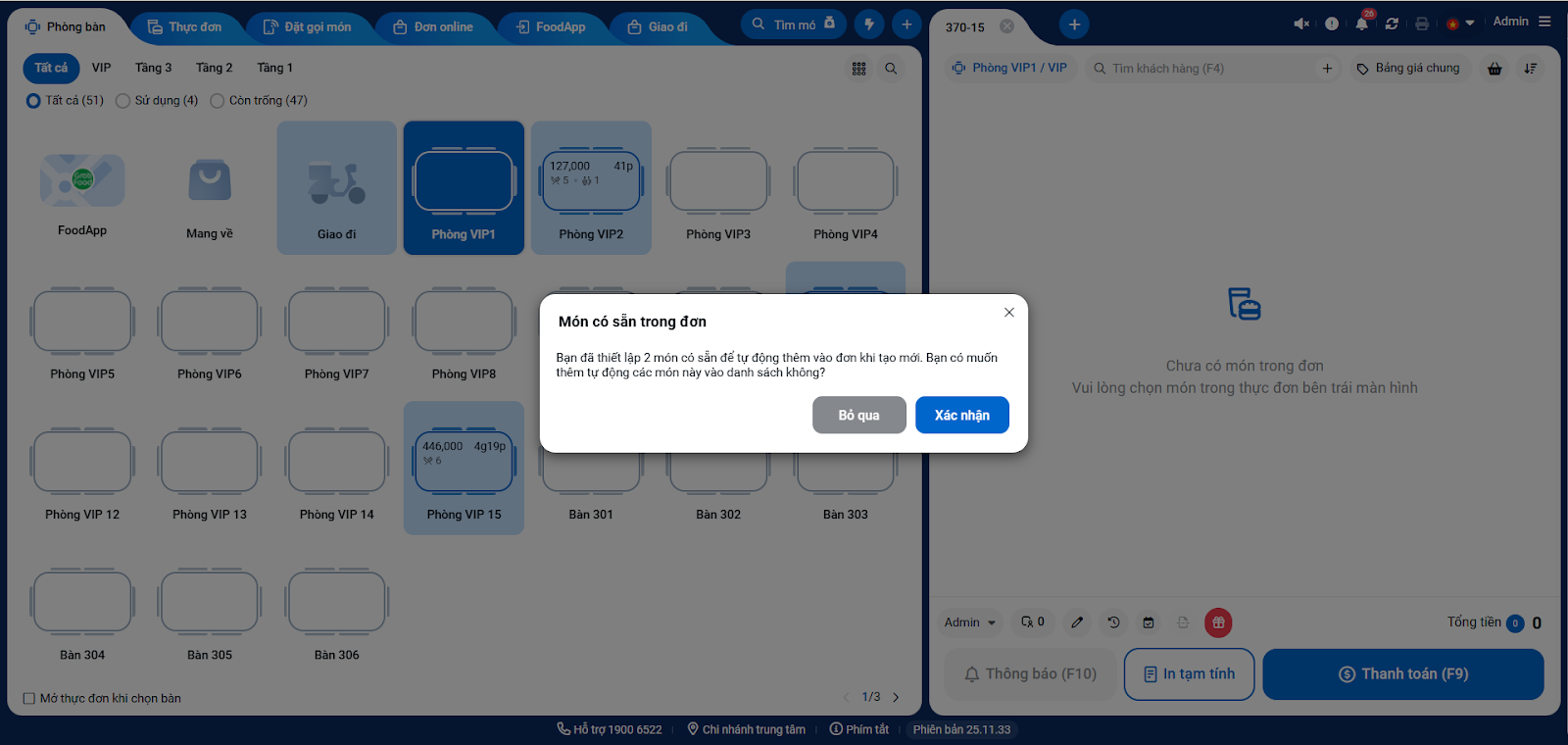 Lưu ý: Khi thêm đơn mới, hệ thống sẽ hiển thị thông báo, bạn chọn Xác nhận để tự động thêm các món này vào đơn.