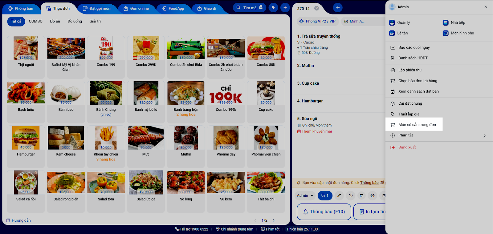 - Trên giao diện màn hình Thu ngân, bạn kích tùy chọn (biểu tượng 3 gạch góc trên bên phải) → chọn Món có sẵn trong đơn.