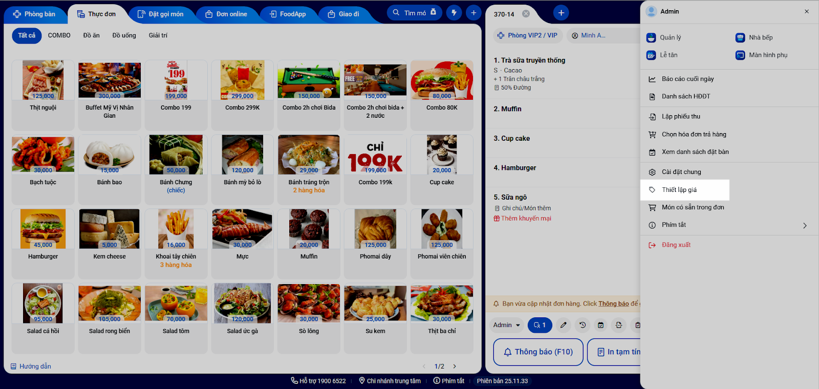 - Tình huống: Khi đang gọi món, bạn phát hiện giá niêm yết của một món bị sai và muốn sửa lại giá gốc trong bảng giá (không chỉ sửa giá trên đơn hàng này).