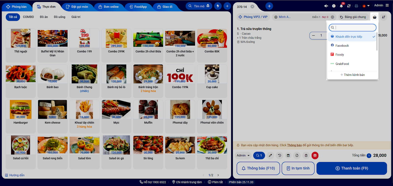 - Cập nhật Kênh bán: Chọn lại kênh bán nếu cần (ví dụ: Đơn tại bàn, Mang về…).