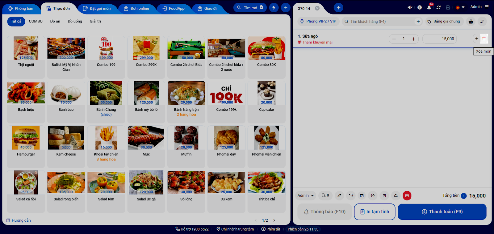 - Lưu ý: Để hủy món, nhân viên cần được phân quyền (không bị tích chọn Không cho phép xóa món).