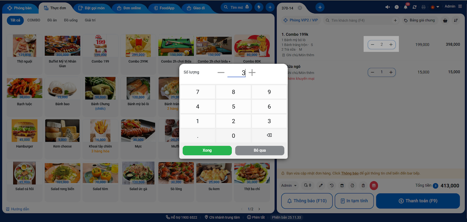 - Chế độ nhập thường: Sau khi chọn món, con trỏ chuột tự động chuyển sang ô số lượng để bạn nhập, sau đó nhấn Enter để thêm vào đơn.