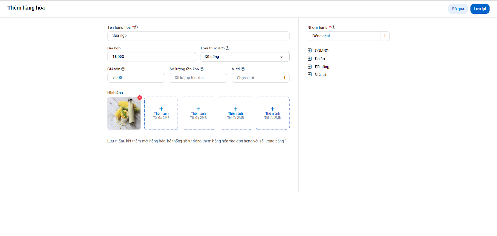 - Nhấn Lưu lại. Món ăn sẽ tự động được thêm vào đơn hàng với số lượng là 1 và đồng thời được lưu vào danh mục hàng hóa của bạn.