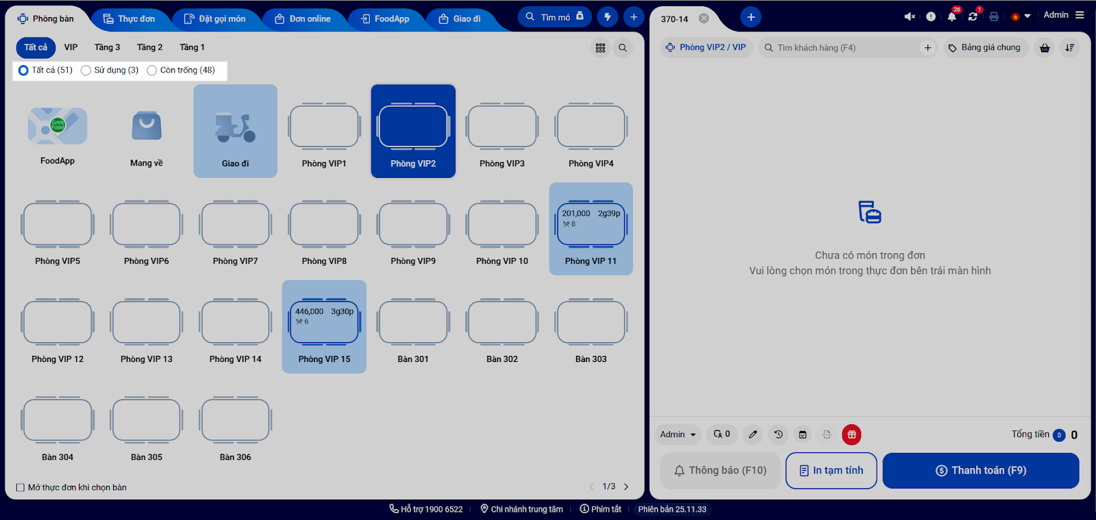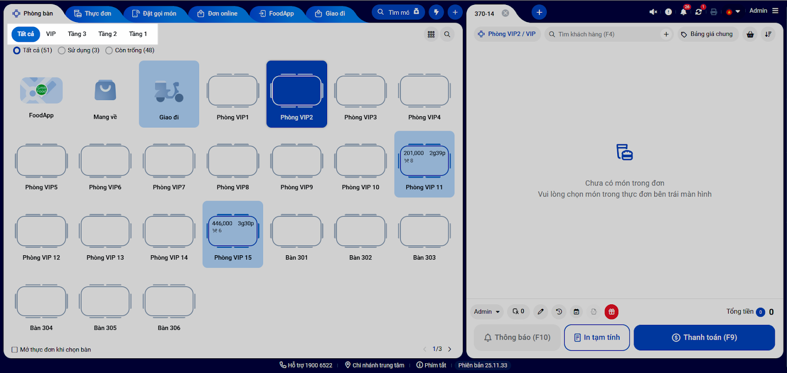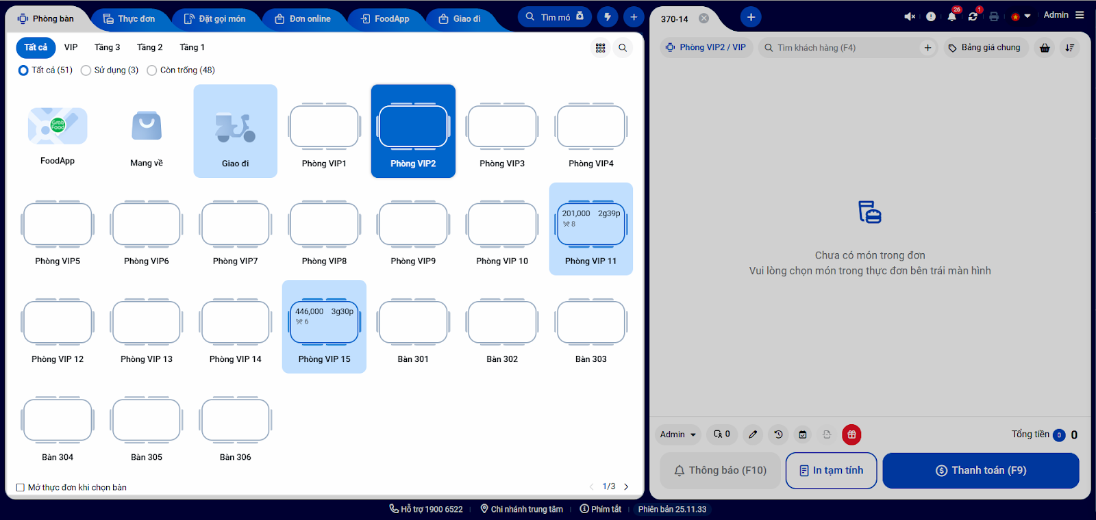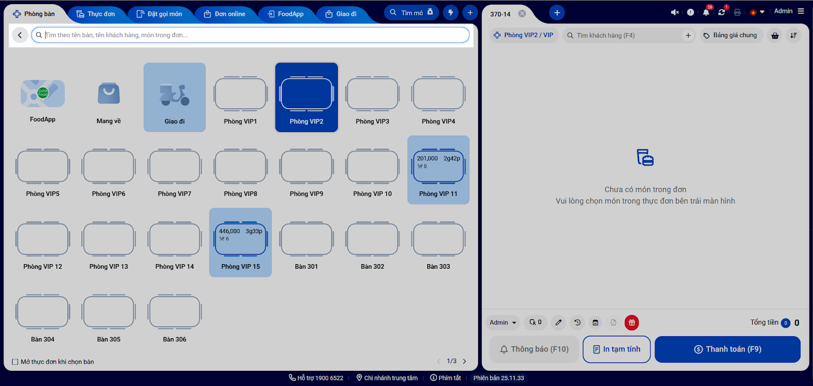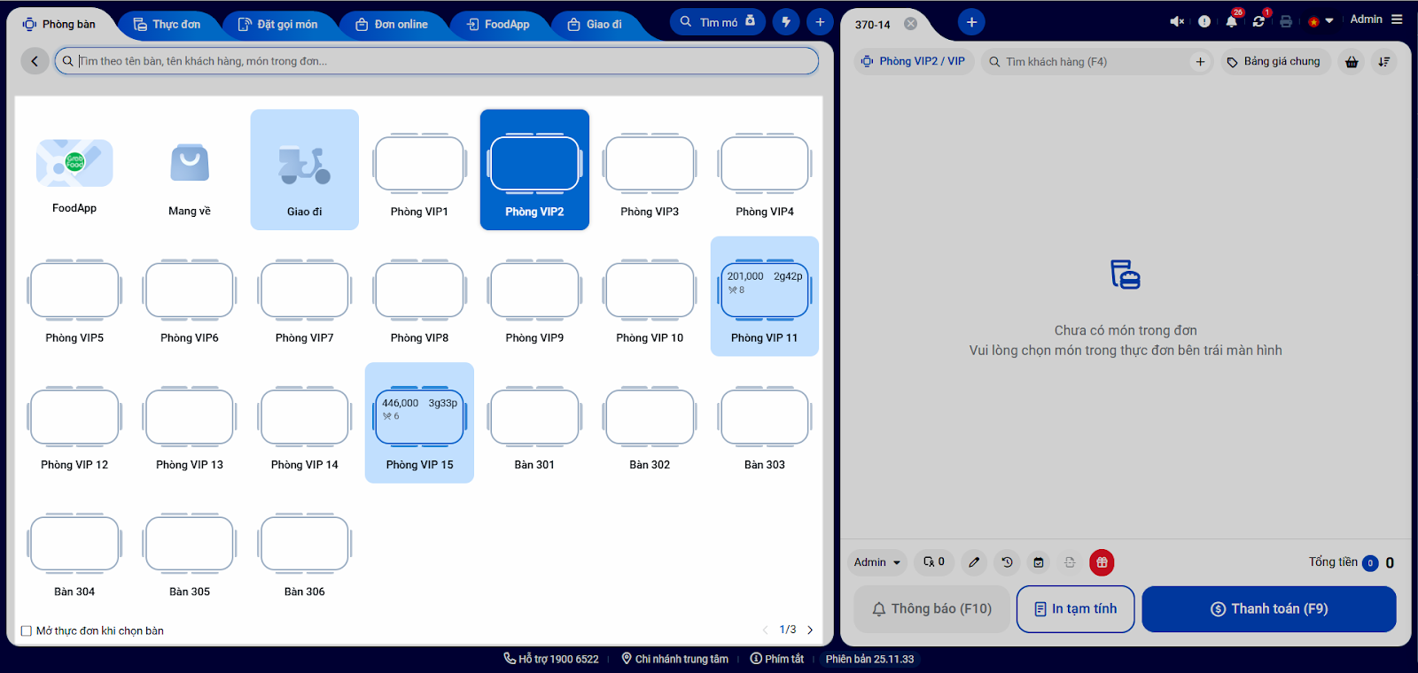 - Chọn phòng/bàn (hoặc bàn Mang về/Giao đi).
