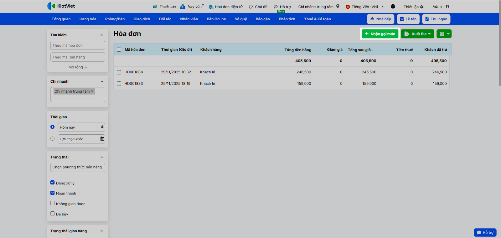- Cách 3: Từ màn hình Quản lý → chọn Giao dịch → Hóa đơn→ nhấn + Nhận gọi món.