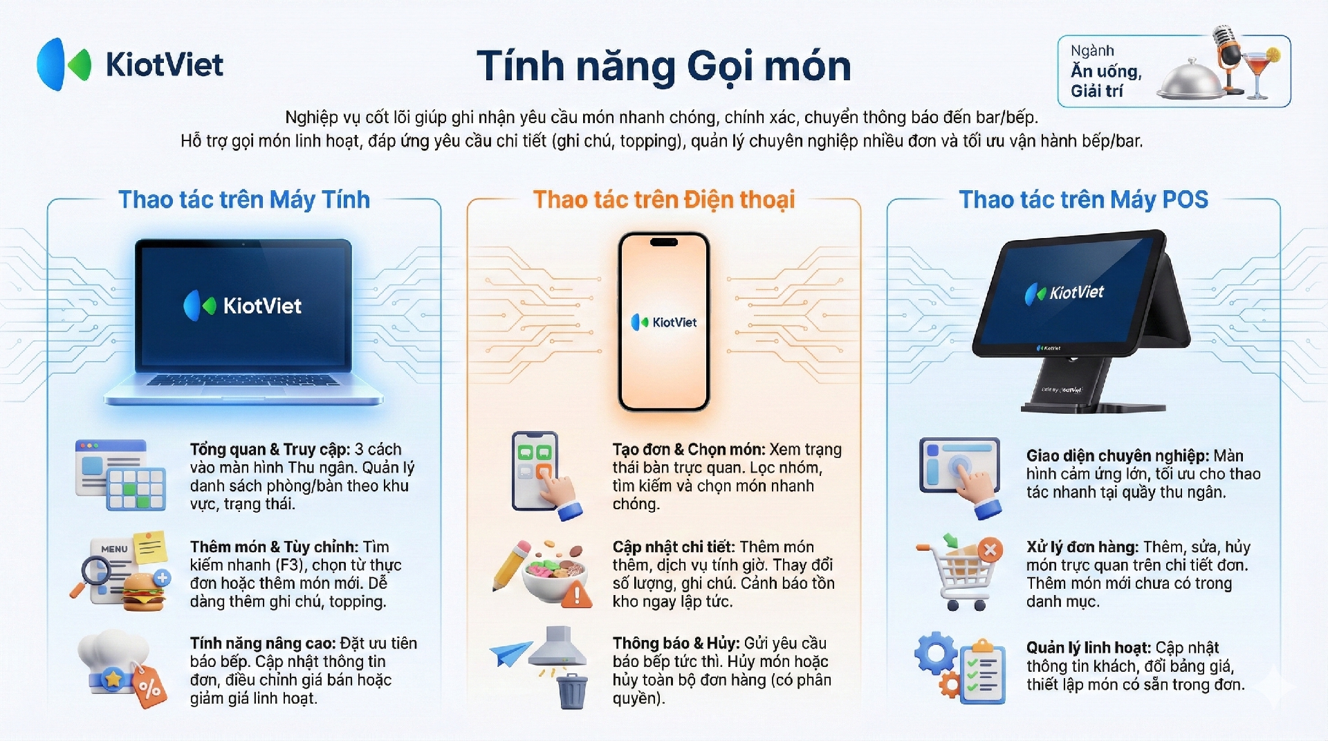 Tính năng Gọi món là nghiệp vụ cốt lõi tại màn hình Thu ngân của KiotViet, giúp nhân viên (phục vụ, thu ngân) ghi nhận các món ăn, đồ uống mà khách yêu cầu một cách nhanh chóng, chính xác và gửi thông báo đến quầy bar/bếp.