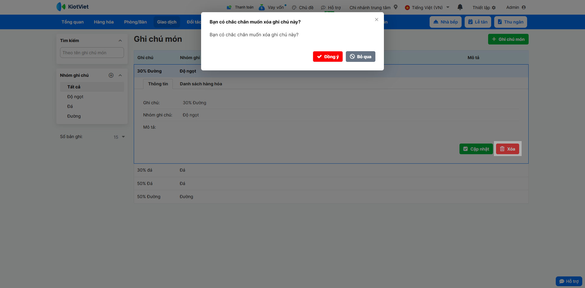2. Để xóa ghi chú món, bạn nhấn Xóa → xác nhận Đồng ý.