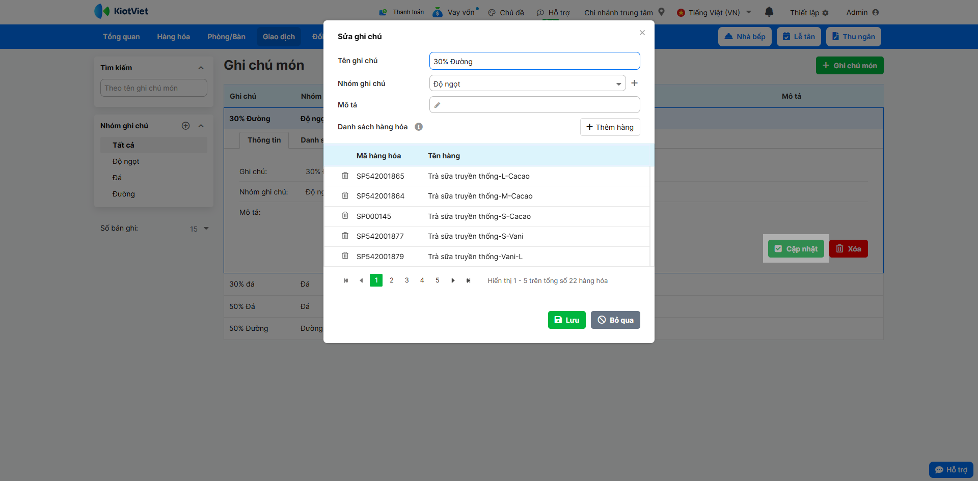1. Để thay đổi thông tin ghi chú món, khi xem chi tiết, bạn nhấn Cập nhật → chỉnh sửa thông tin → nhấn Lưu.