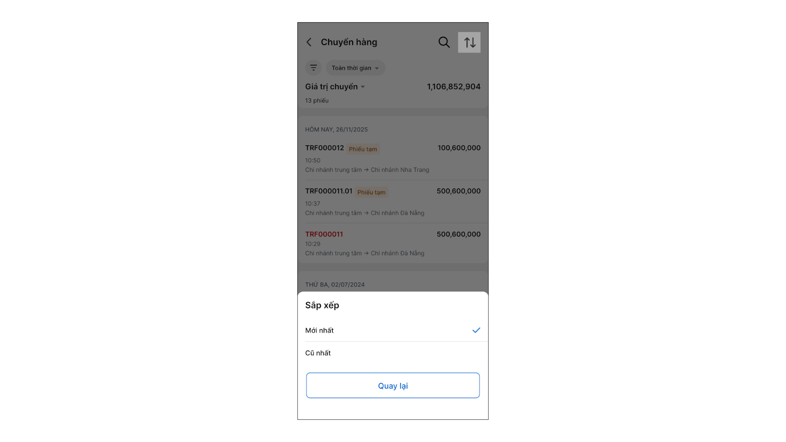 - Sắp xếp: Chạm vào biểu tượng sắp xếp và chọn Mới nhất hoặc Cũ nhất.