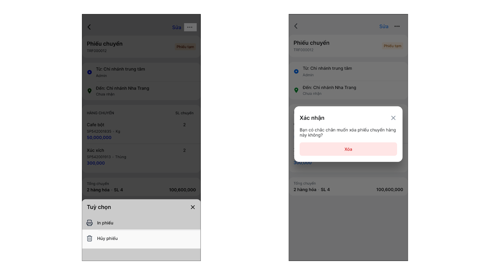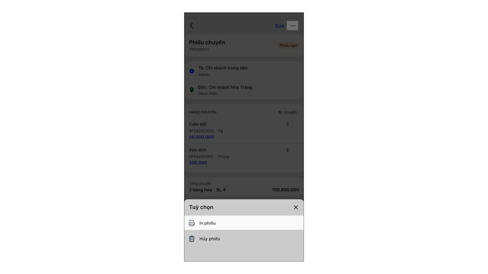 - Hủy phiếu: Mở chi tiết phiếu, chạm vào biểu tượng (ba chấm) → chọn Hủy phiếu → Xóa.