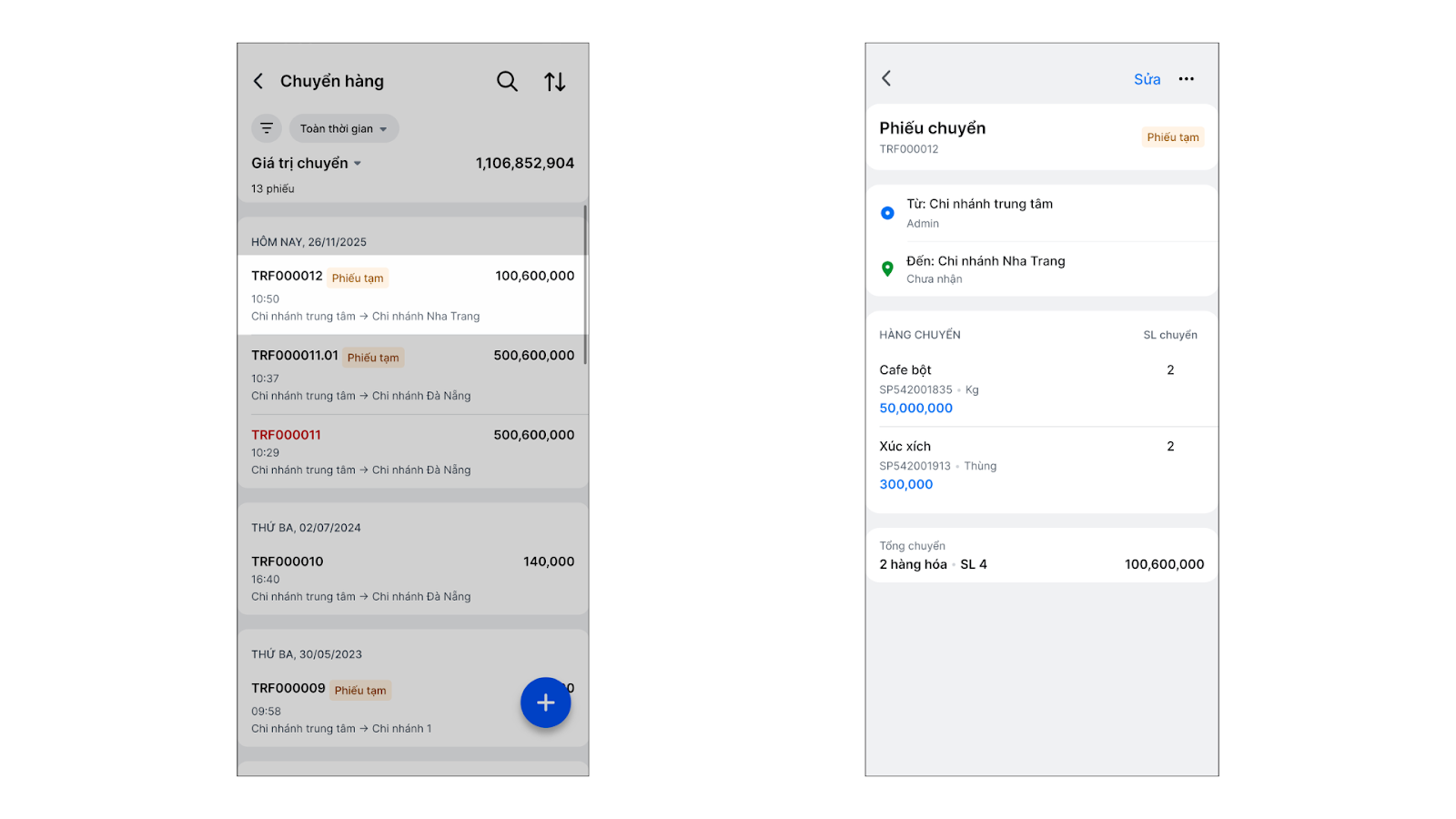- Xem danh sách/chi tiết: Chạm Chuyển hàng trên menu để xem danh sách. Chạm vào một phiếu bất kỳ để xem thông tin chi tiết.