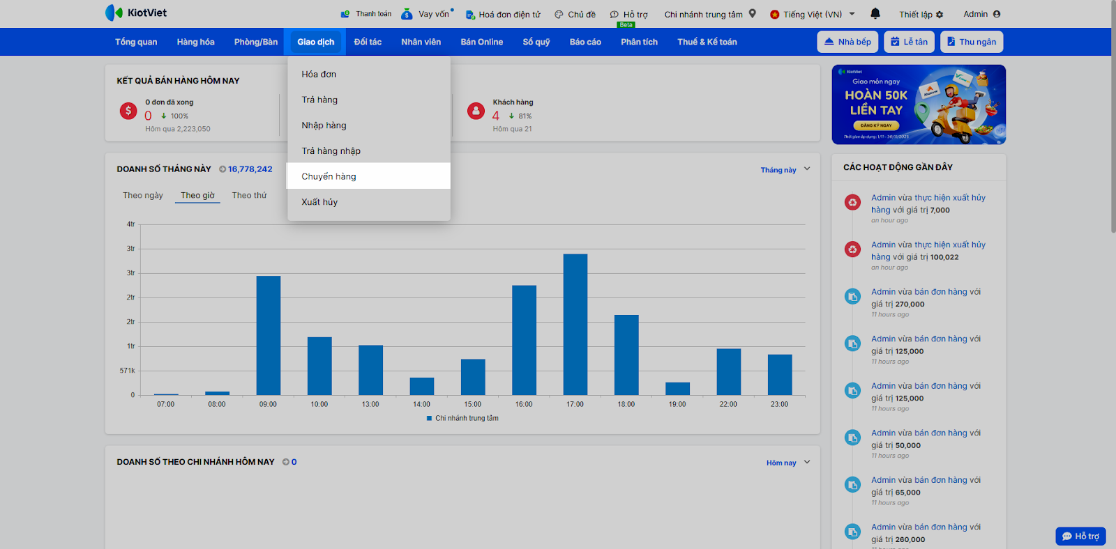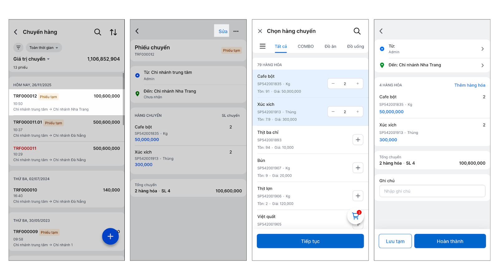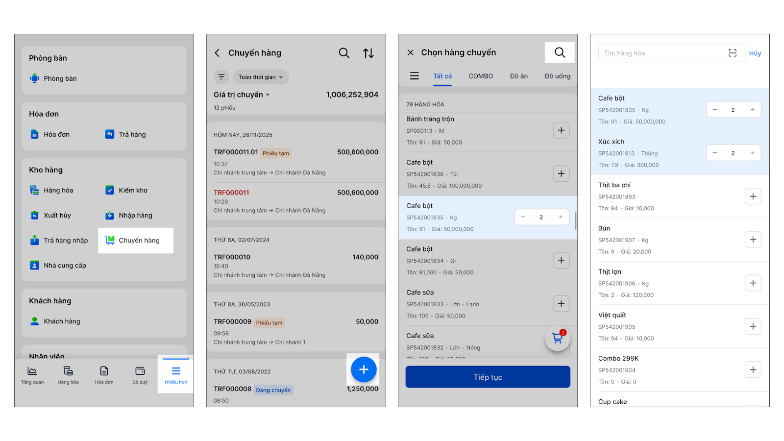 Đối với các nhà hàng, chuỗi cà phê có nhiều chi nhánh, việc luân chuyển hàng hóa (nguyên vật liệu, đồ uống, công cụ…) từ chi nhánh này đến chi nhánh khác thường xuyên diễn ra. Tính năng Chuyển hàng giúp bạn quản lý quá trình này một cách hệ thống, đảm bảo hàng hóa được giao nhận chính xác.