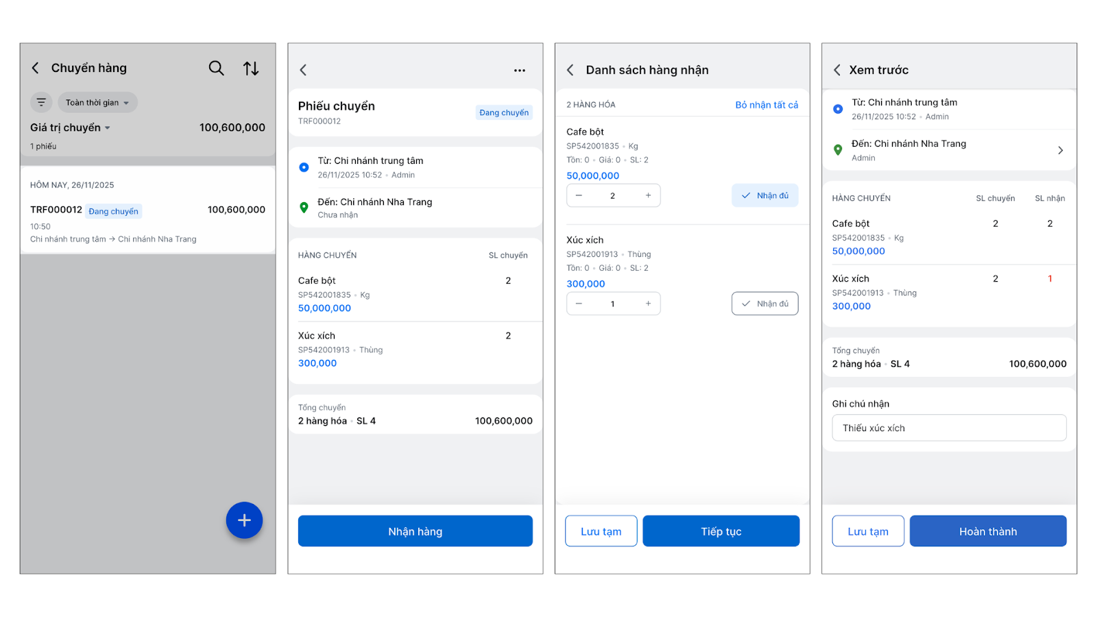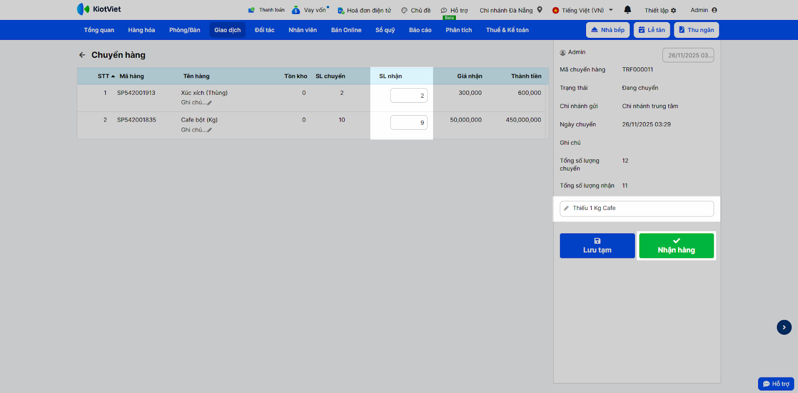 - Bạn đếm hàng thực tế và cập nhật lại Số lượng nhận nếu có chênh lệch (ví dụ: Chi nhánh trung tâm gửi 10 nhưng bạn chỉ nhận được 9).
