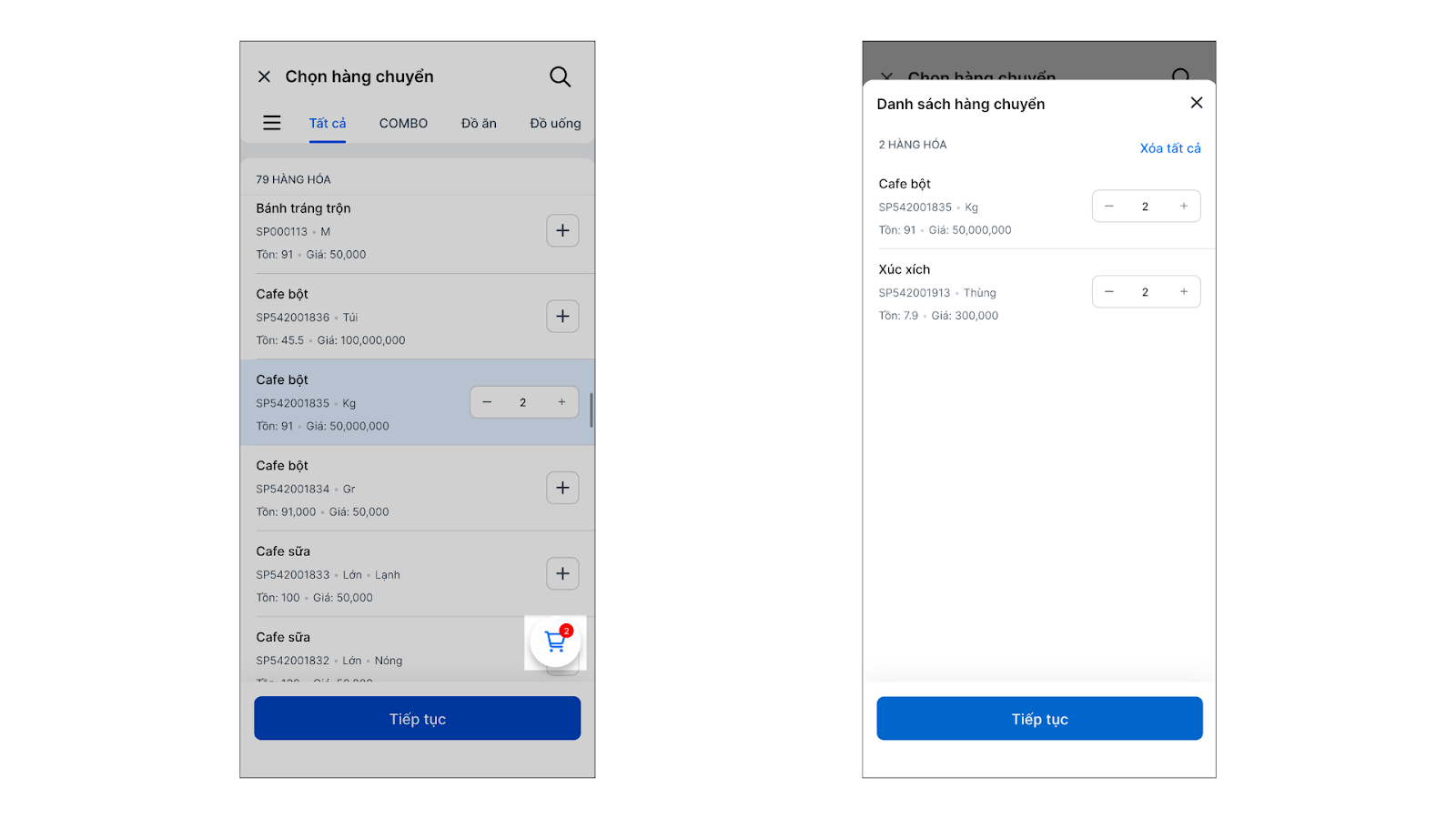 - Bạn có thể xem lại danh sách hàng chuyển đã chọn bằng cách nhấn vào biểu tượng xe đẩy