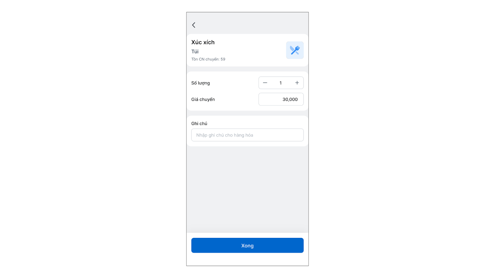 - Nhập số lượng, chỉnh sửa giá chuyển cho từng hàng hóa (nếu cần) và chạm Xong để thêm hàng vào phiếu.