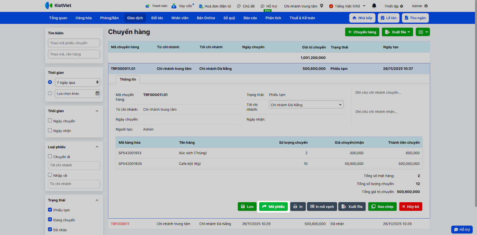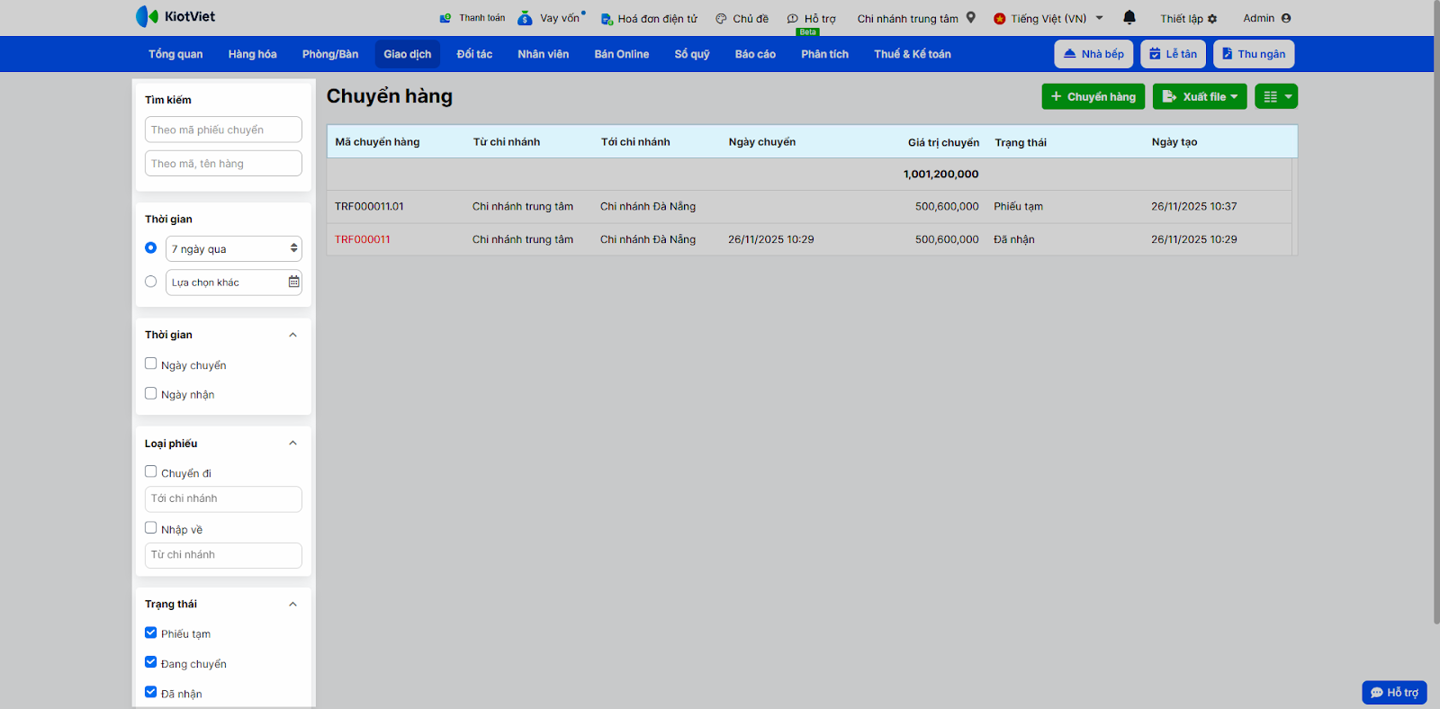 - Trạng thái (Phiếu tạm, Đang chuyển, Đã nhận, Đã hủy).