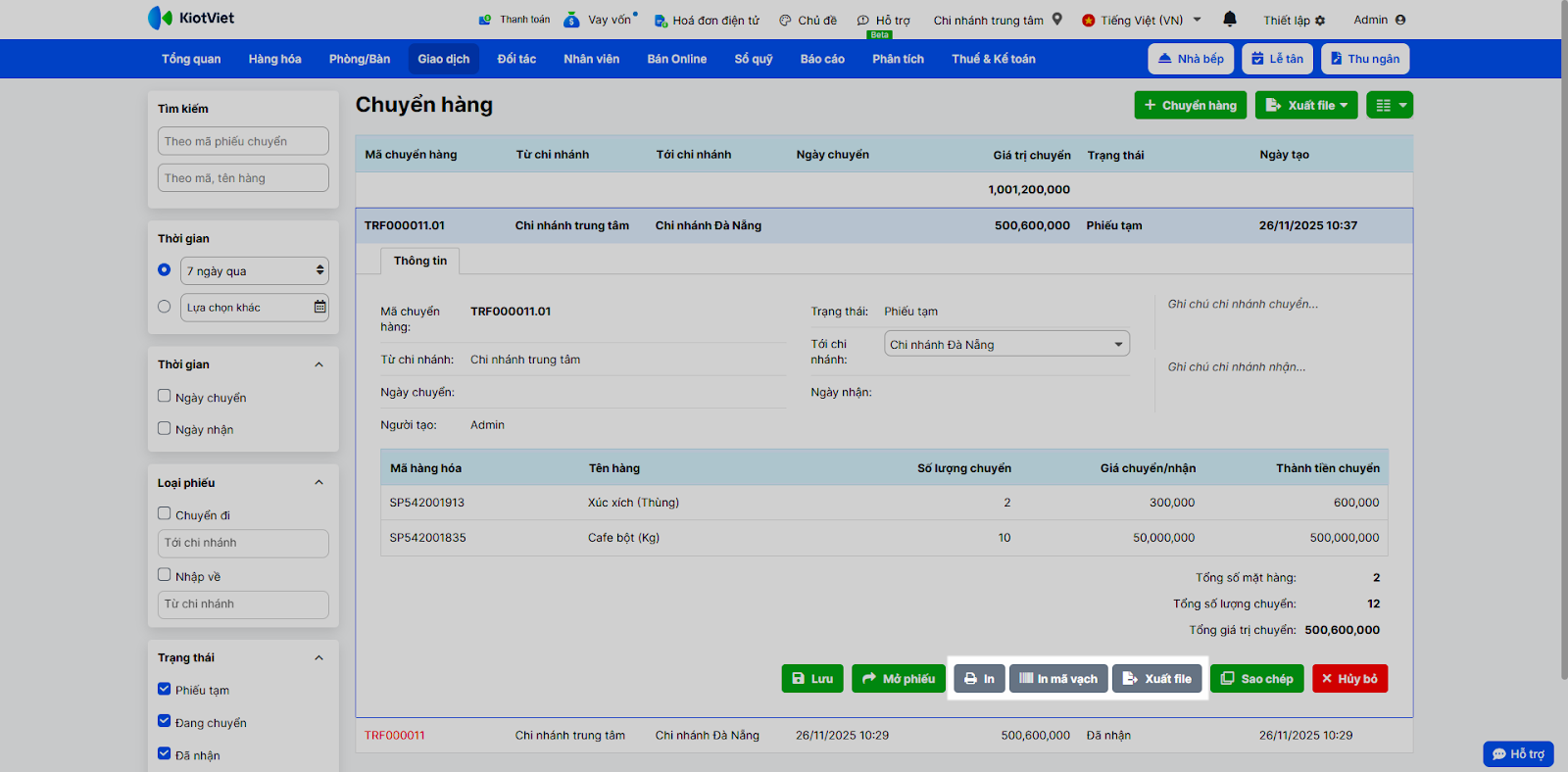 - Tình huống: Bạn cần xuất file Excel tất cả các phiếu chuyển trong tháng, hoặc in một phiếu chuyển cụ thể để làm chứng từ giao nhận.