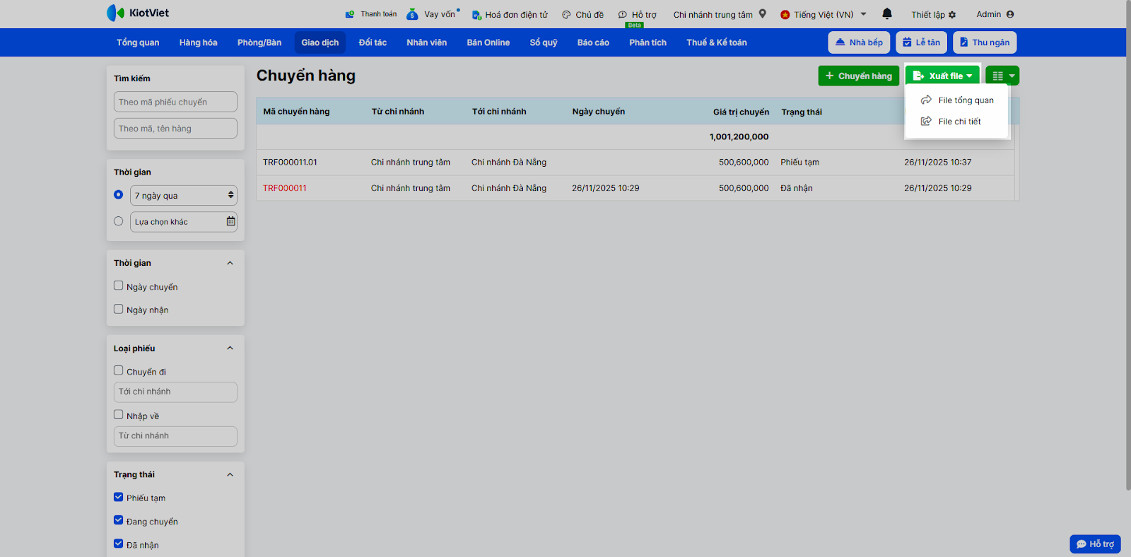 - Xuất file (Danh sách): Tại màn hình danh sách Chuyển hàng, nhấn Xuất file → chọn File tổng quan hoặc File chi tiết.