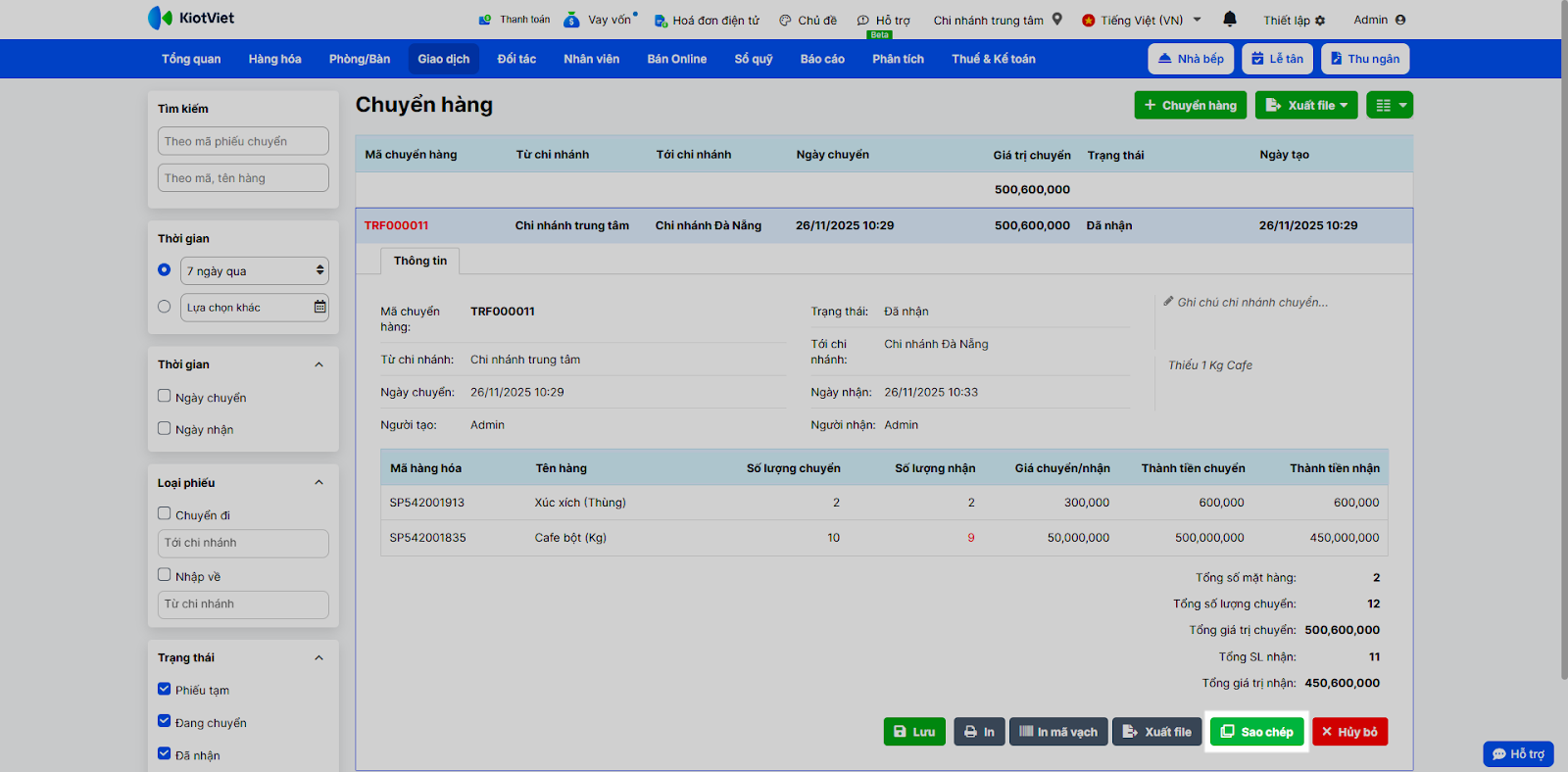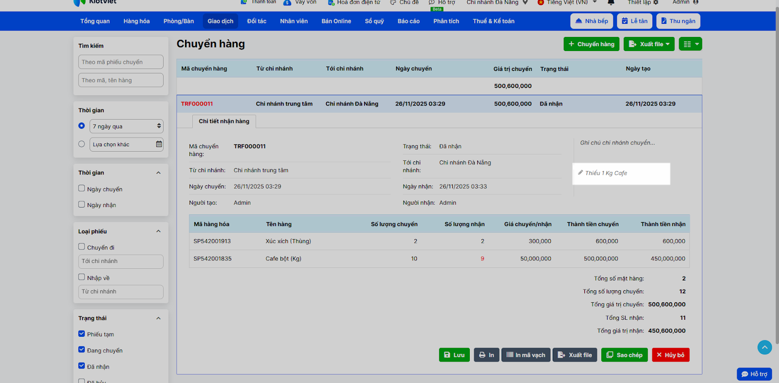 Lưu ý: Nếu số lượng nhận nhỏ hơn số lượng chuyển, hệ thống sẽ tự động cộng lại số lượng chênh lệch vào tồn kho của chi nhánh chuyển.