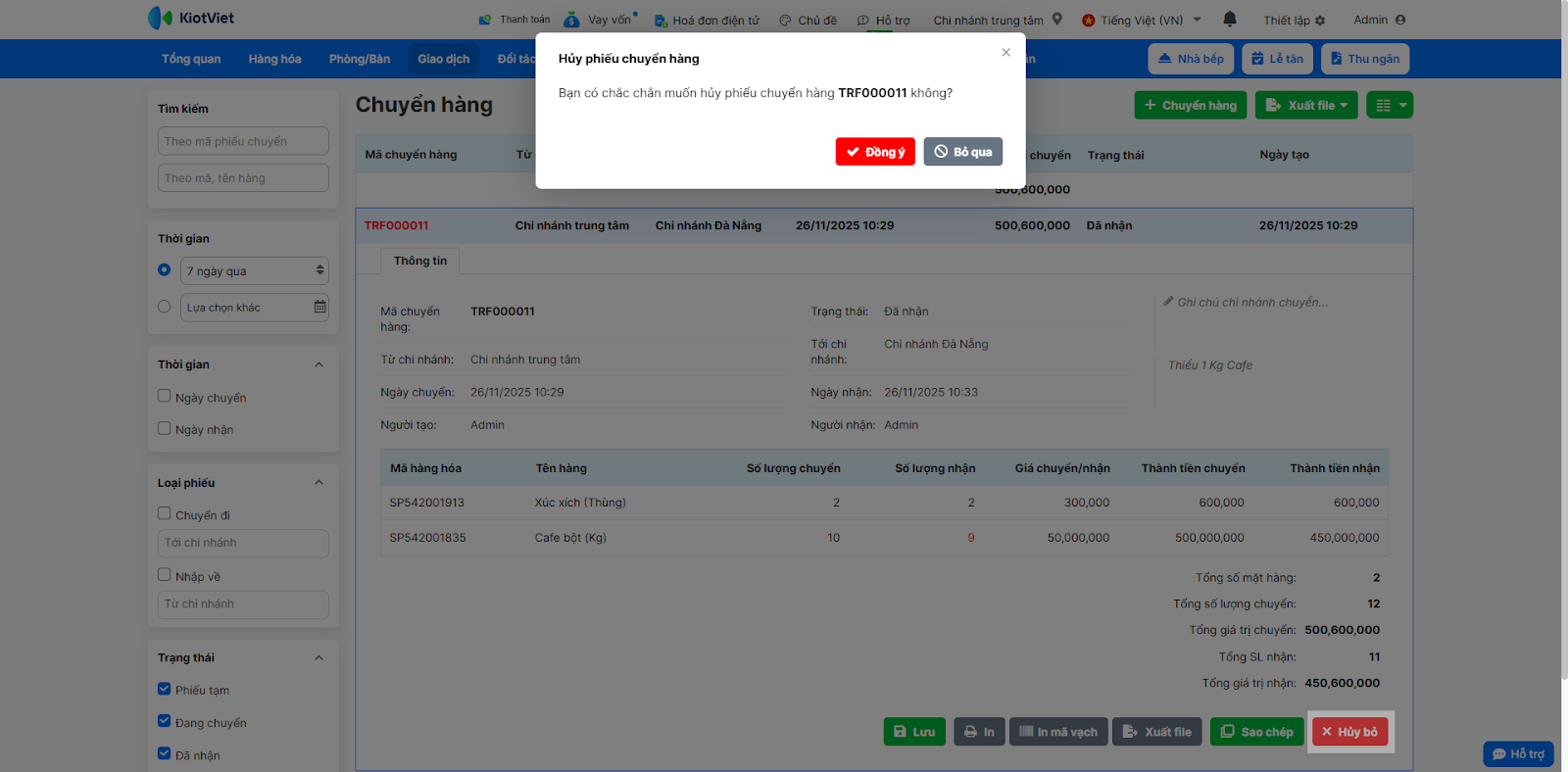 - Nhấn nút Hủy bỏ → chọn Đồng ý để xác nhận thông tin. Hệ thống sẽ tự động cộng lại tồn kho cho chi nhánh chuyển và giảm trừ tồn kho tại chi nhánh nhận (nếu phiếu đã được nhận).