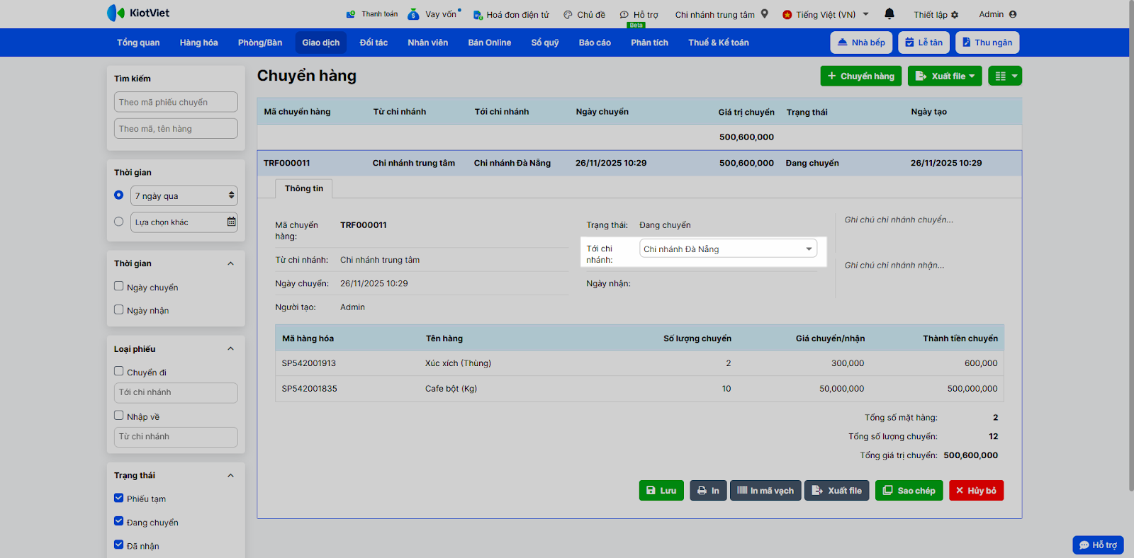 - Với phiếu trạng thái Đang chuyển, hệ thống chỉ cho phép thay đổi thông tin Tới chi nhánh.