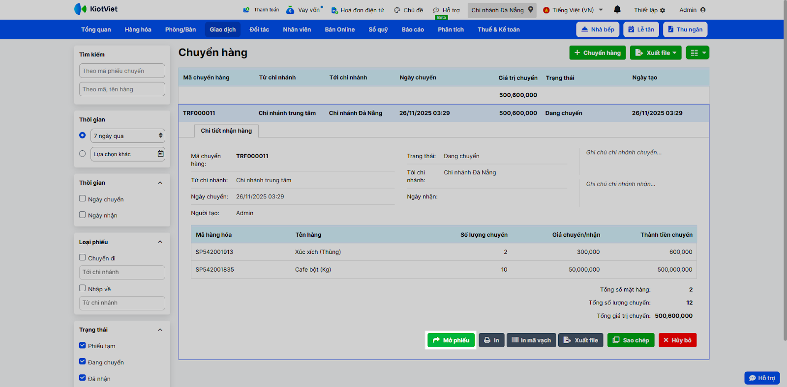 - Tình huống: Bạn tạo phiếu “Đang chuyển” nhưng chọn nhầm chi nhánh nhận, hoặc bạn muốn thêm ghi chú cho phiếu đã nhận.