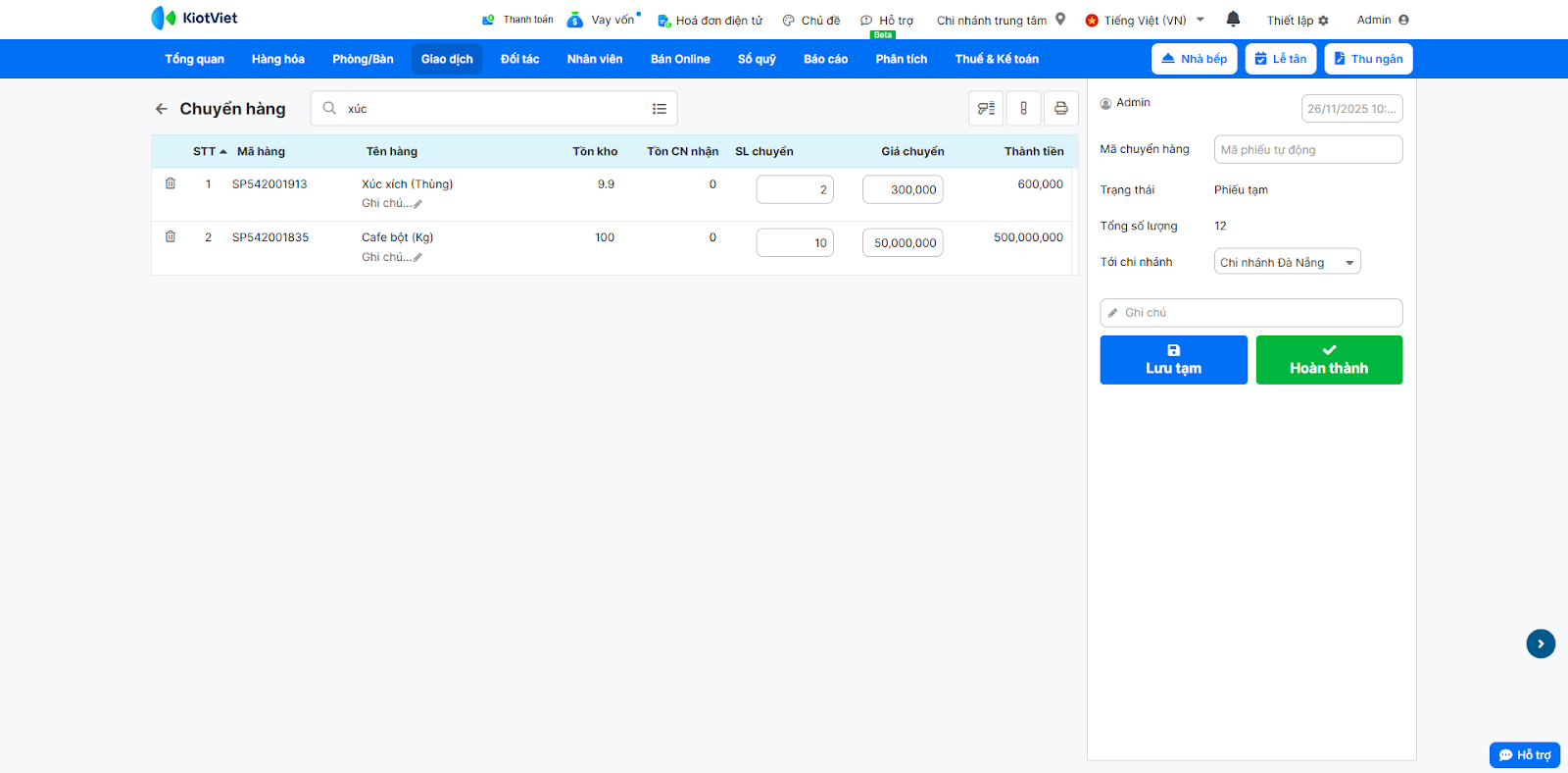 - Nhấn Hoàn thành để phiếu chuyển sang trạng thái Đang chuyển. Hoặc nhấn Lưu tạm nếu bạn cần chỉnh sửa sau.