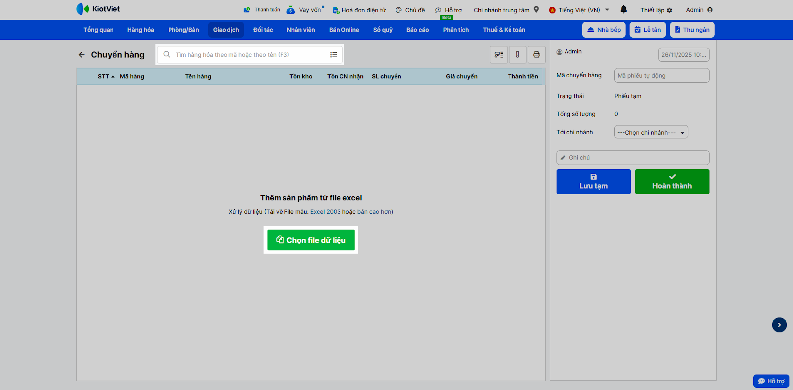 - Cách 2 (Import từ file Excel): Tải file mẫu về, nhập Mã hàng, Số lượng chuyển, Giá chuyển (thường là giá vốn), sau đó Chọn file dữ liệu để tải lên.