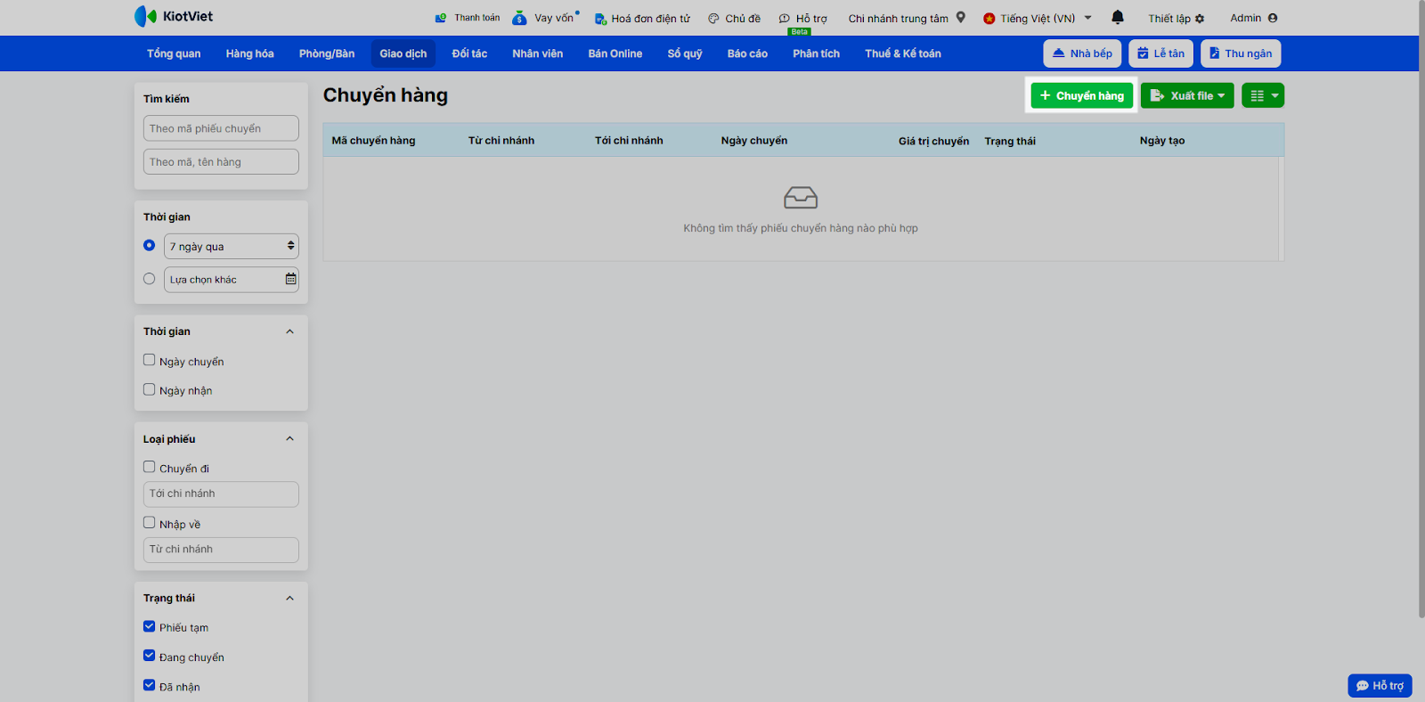 - Tình huống: Bạn muốn tìm lại tất cả các phiếu chuyển hàng đến “Chi nhánh Đà Nẵng” trong 7 ngày qua.