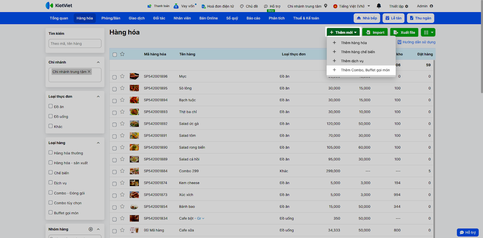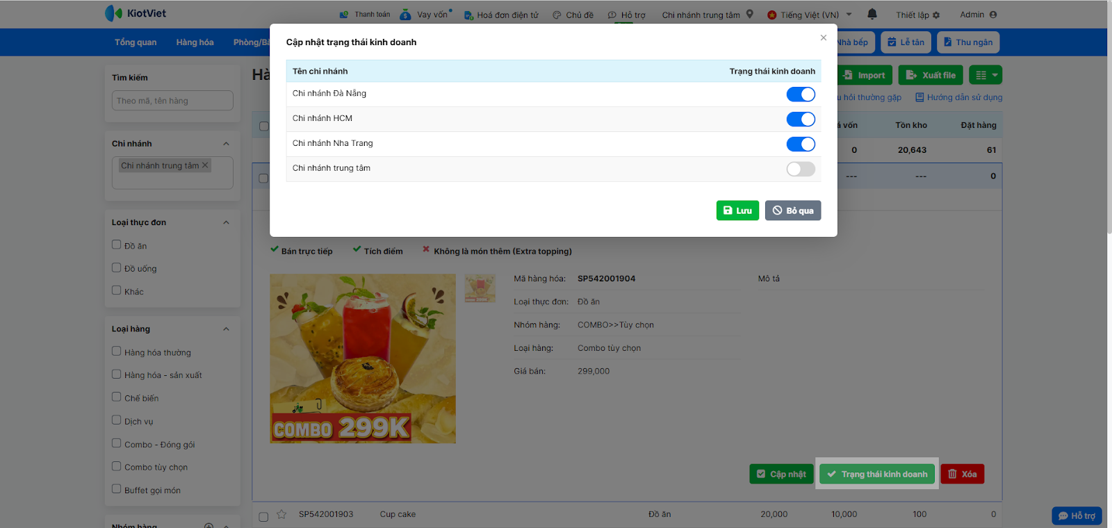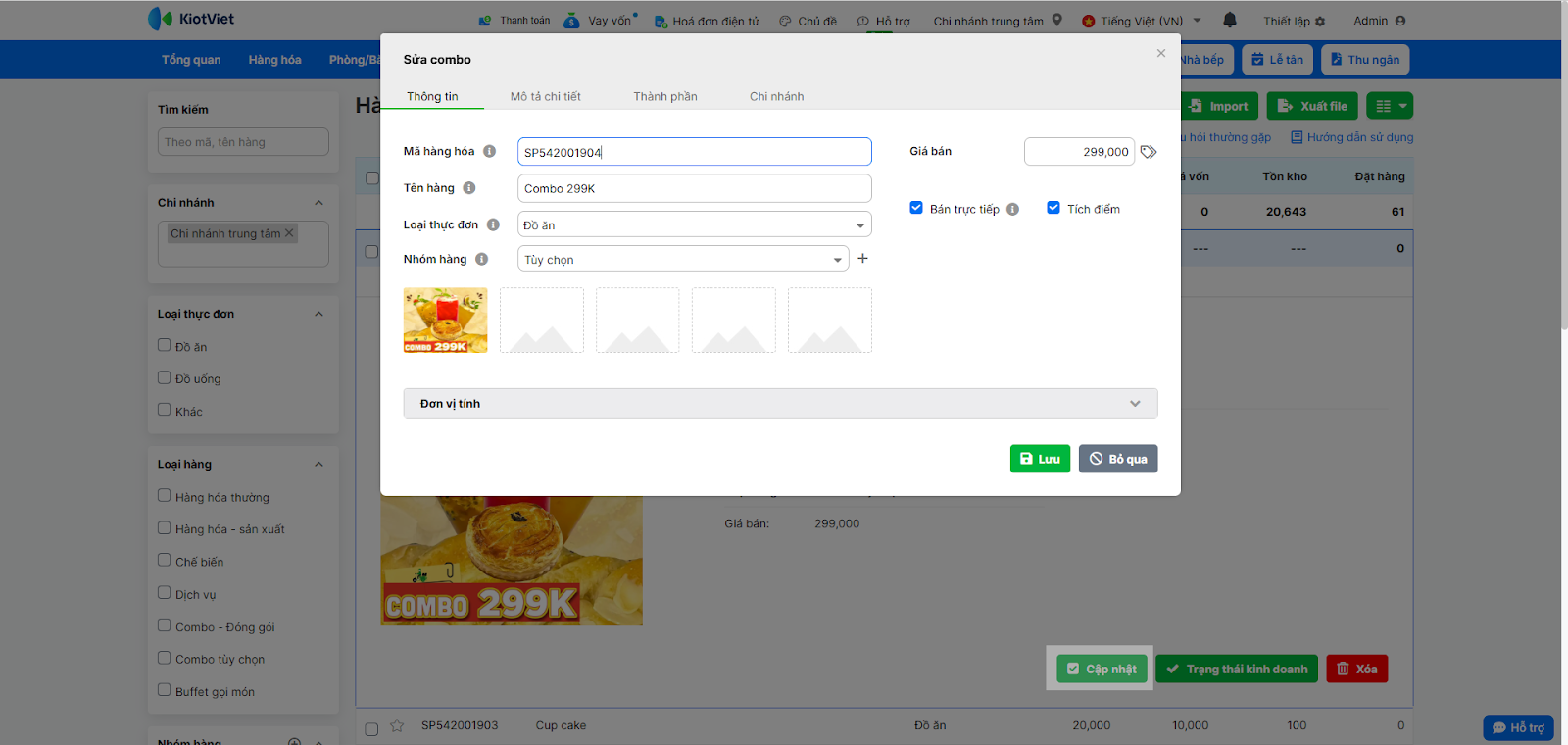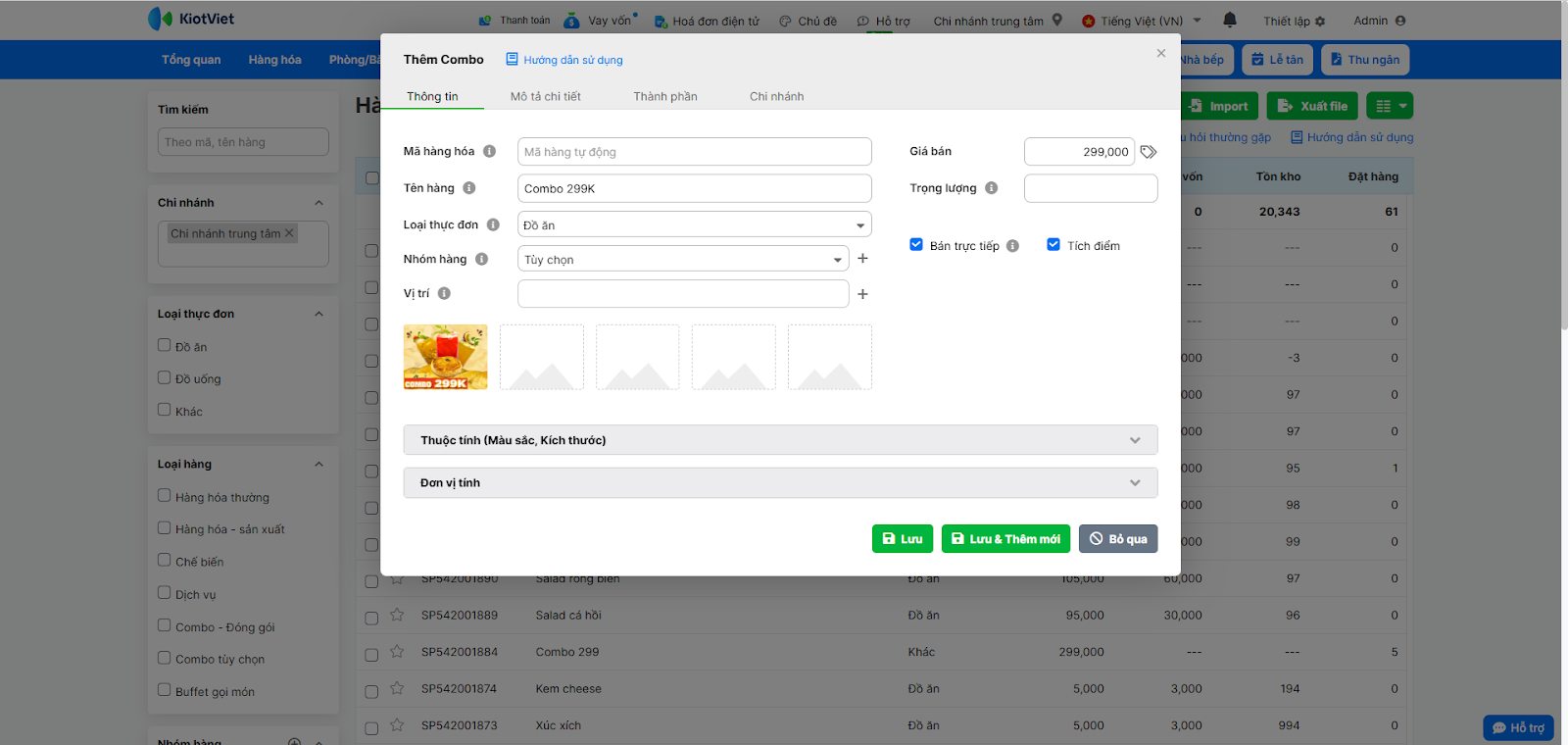 - Tự động hóa: Hệ thống tự động tính giá vốn và trừ tồn kho chính xác cho từng món thành phần được chọn khi bán combo.