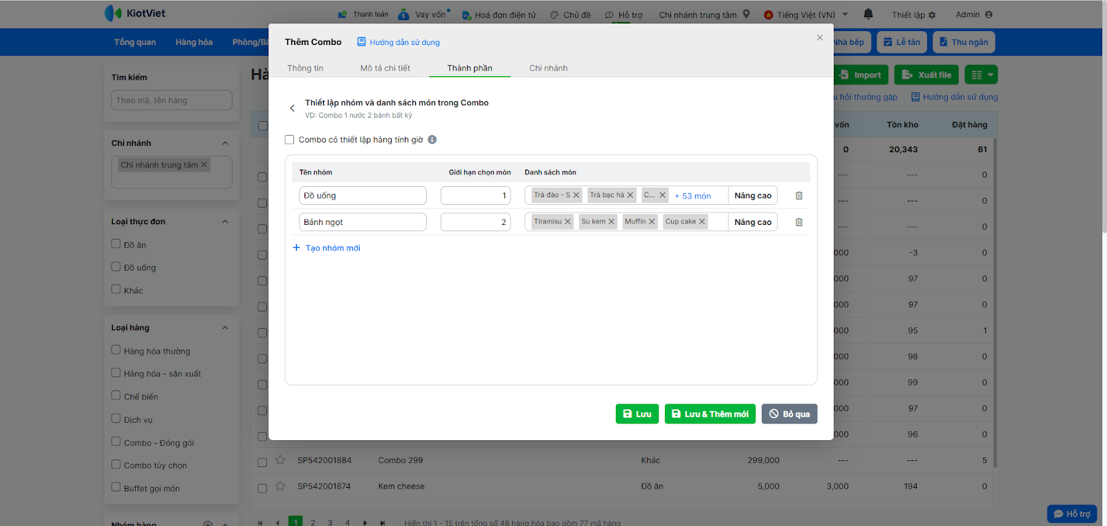 - Tình huống: Nhà hàng của bạn muốn tạo một “Combo 299K”, cho phép khách được chọn 1 món trong nhóm “Đồ uống” và 2 món trong nhóm “Bánh ngọt”.