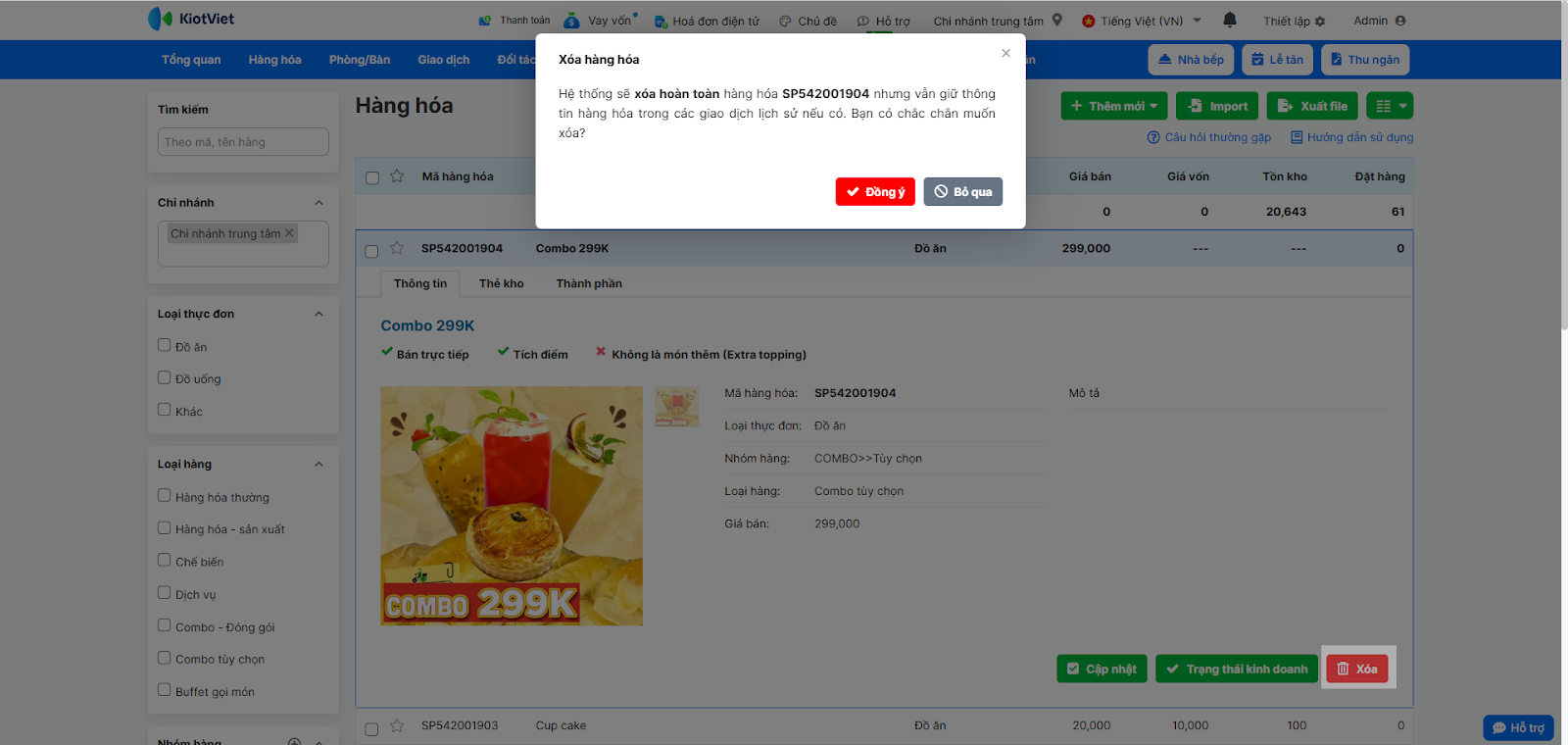 - Hàng hóa đã xóa sẽ có thêm hậu tố {DEL} và vẫn được lưu trong các giao dịch lịch sử.