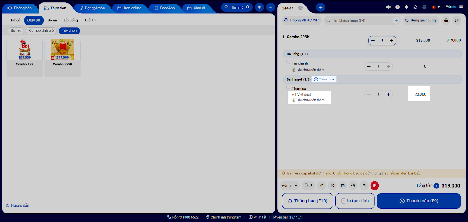 - Tình huống: Khách hàng gọi “Combo 299K”. Bạn cần thêm combo vào đơn hàng và chọn các món theo yêu cầu của khách.