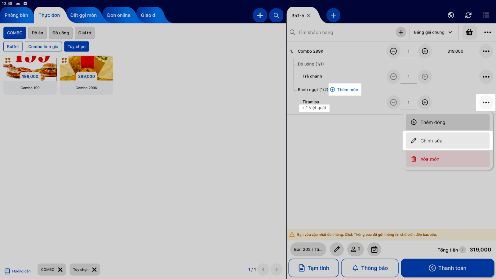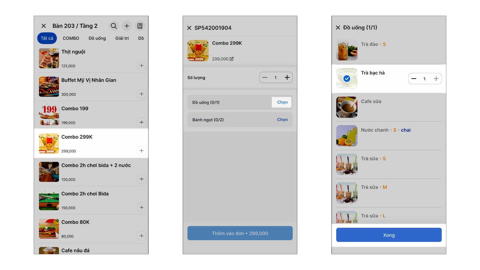 - Tình huống: Nhân viên phục vụ sử dụng ứng dụng di động để nhận order “Combo 299K” tại bàn của khách.