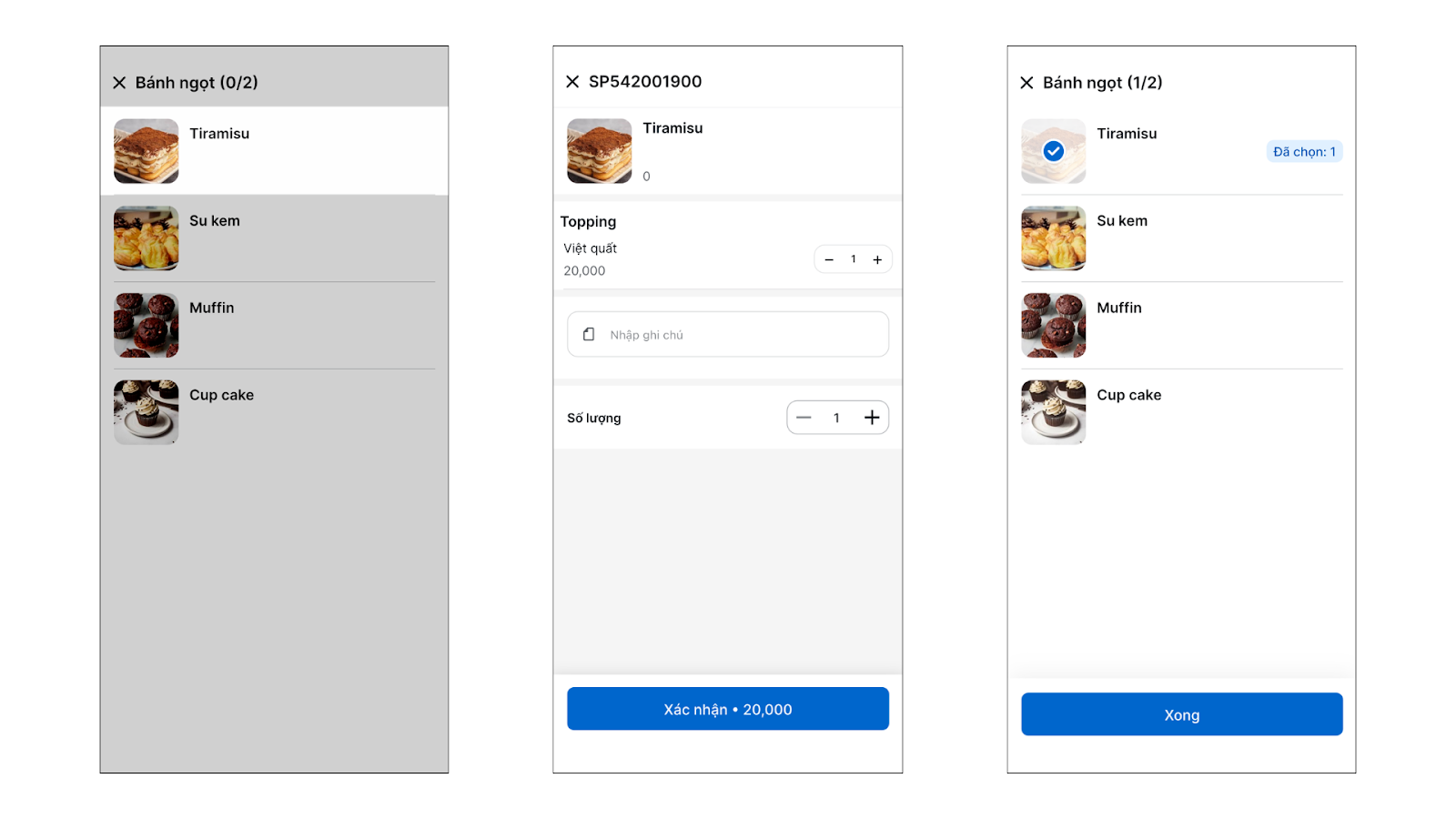 - Lặp lại thao tác cho các nhóm khác (ví dụ: chọn 2 món trong nhóm “Bánh ngọt”).