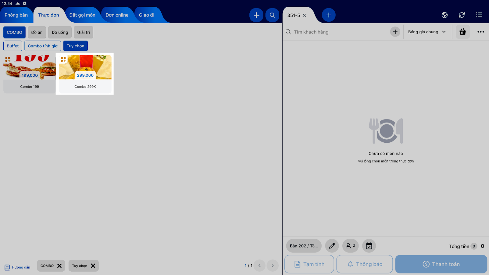 - Trên màn hình Thu ngân, bạn tìm và chọn “Combo 299K” từ Thực đơn.
