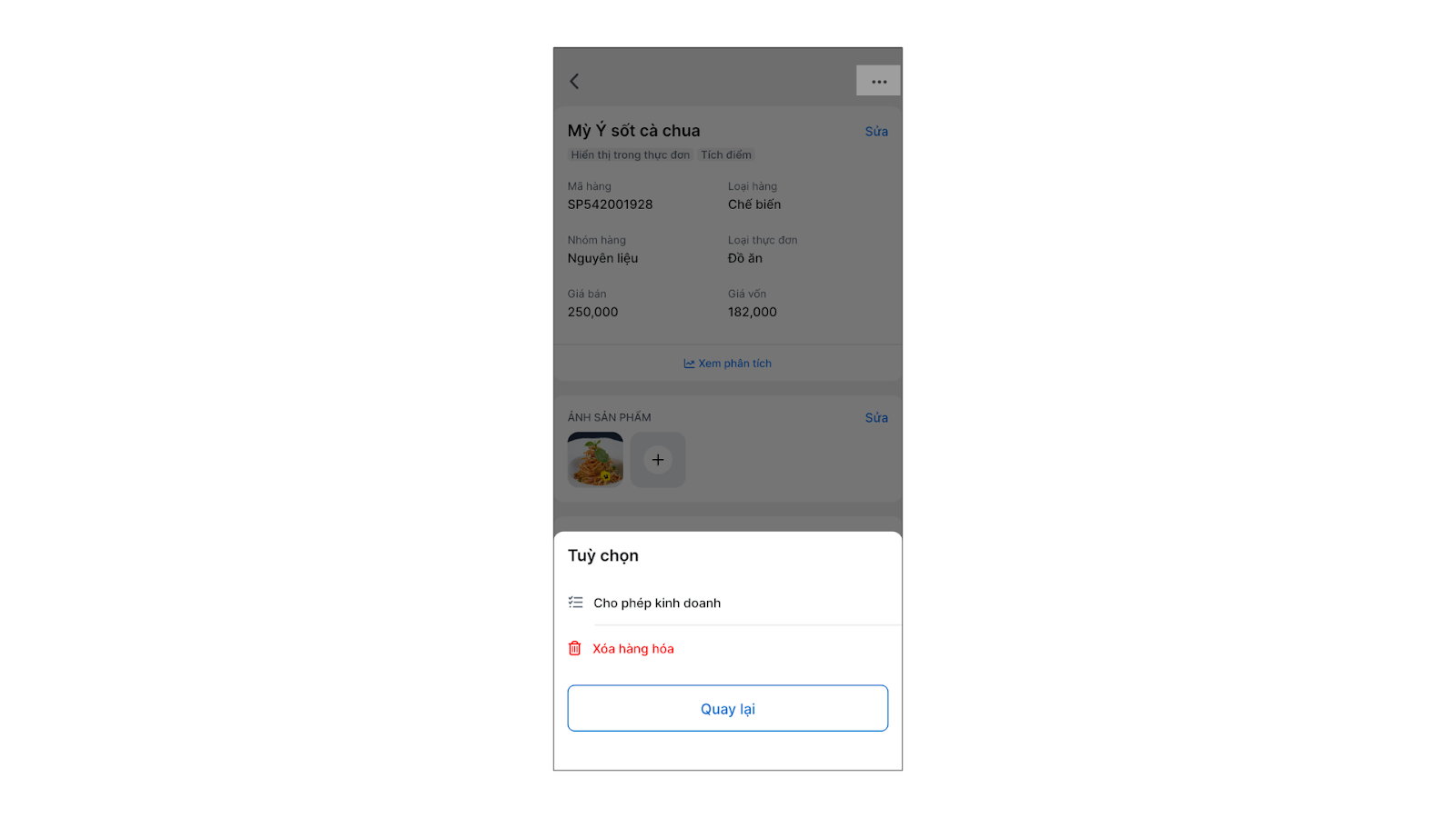- Xóa/ Ngừng kinh doanh: Trong màn hình chi tiết món, chạm vào biểu tượng ba chấm (…) và chọn Xóa hoặc Cho phép kinh doanh (bỏ chọn các chi nhánh không muốn kinh doanh hàng hóa).