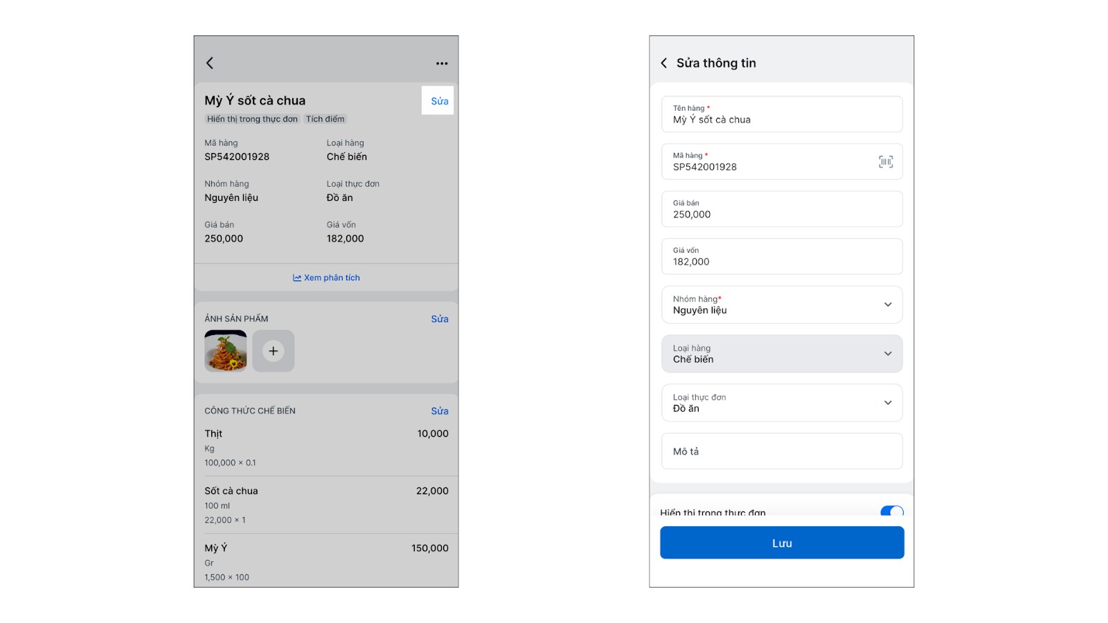 - Tình huống: Bạn cần thay đổi công thức (định lượng) hoặc giá bán của món.