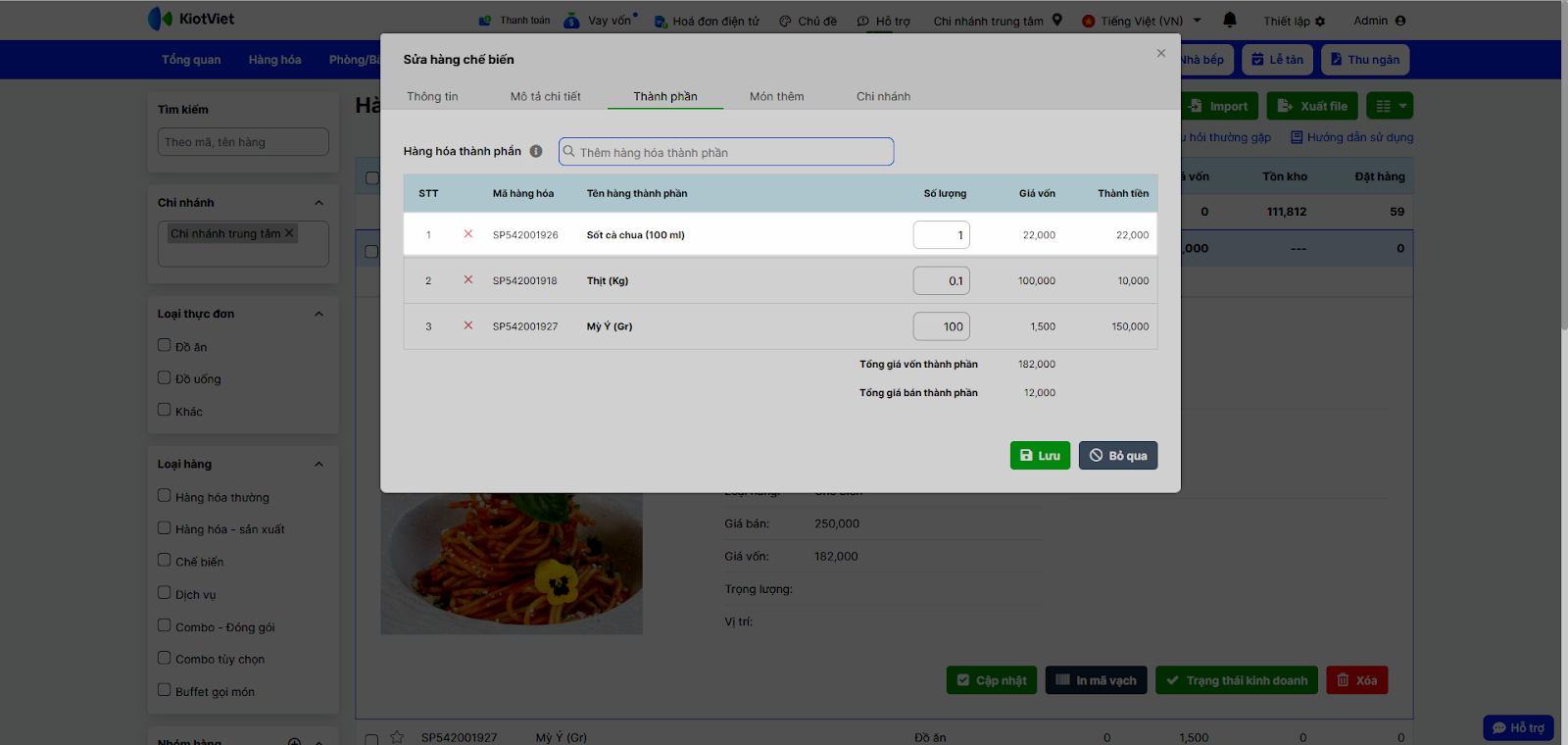 - Thao tác: KiotViet hỗ trợ bạn thực hiện việc này. Khi bán 1 đĩa “Mỳ Ý sốt cà chua”, hệ thống sẽ trừ tồn kho của “Nước sốt cà chua” (nếu bạn quản lý tồn kho của sốt) hoặc sẽ trừ thẳng tồn kho của cà chua, hành tây… (nếu nước sốt cà chua cũng là hàng chế biến).