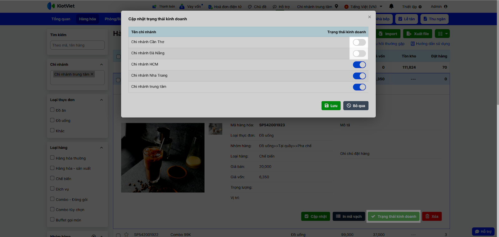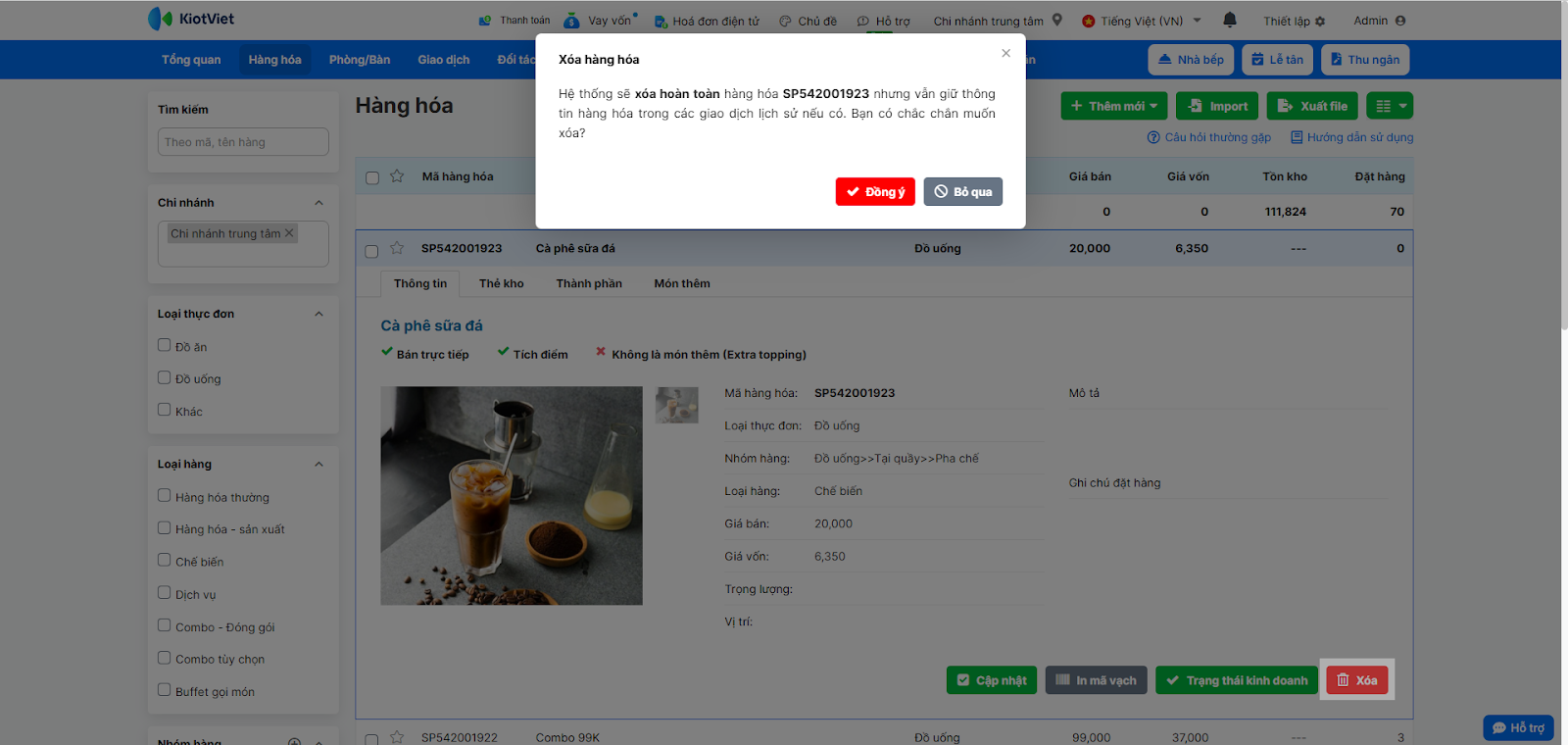 Lưu ý: Nếu đã phát sinh giao dịch, bạn nên tắt Trạng thái kinh doanh thay vì xóa.
