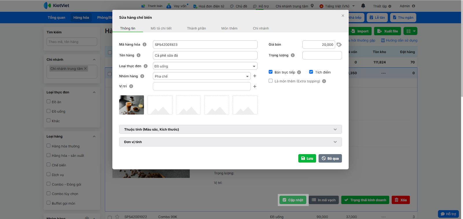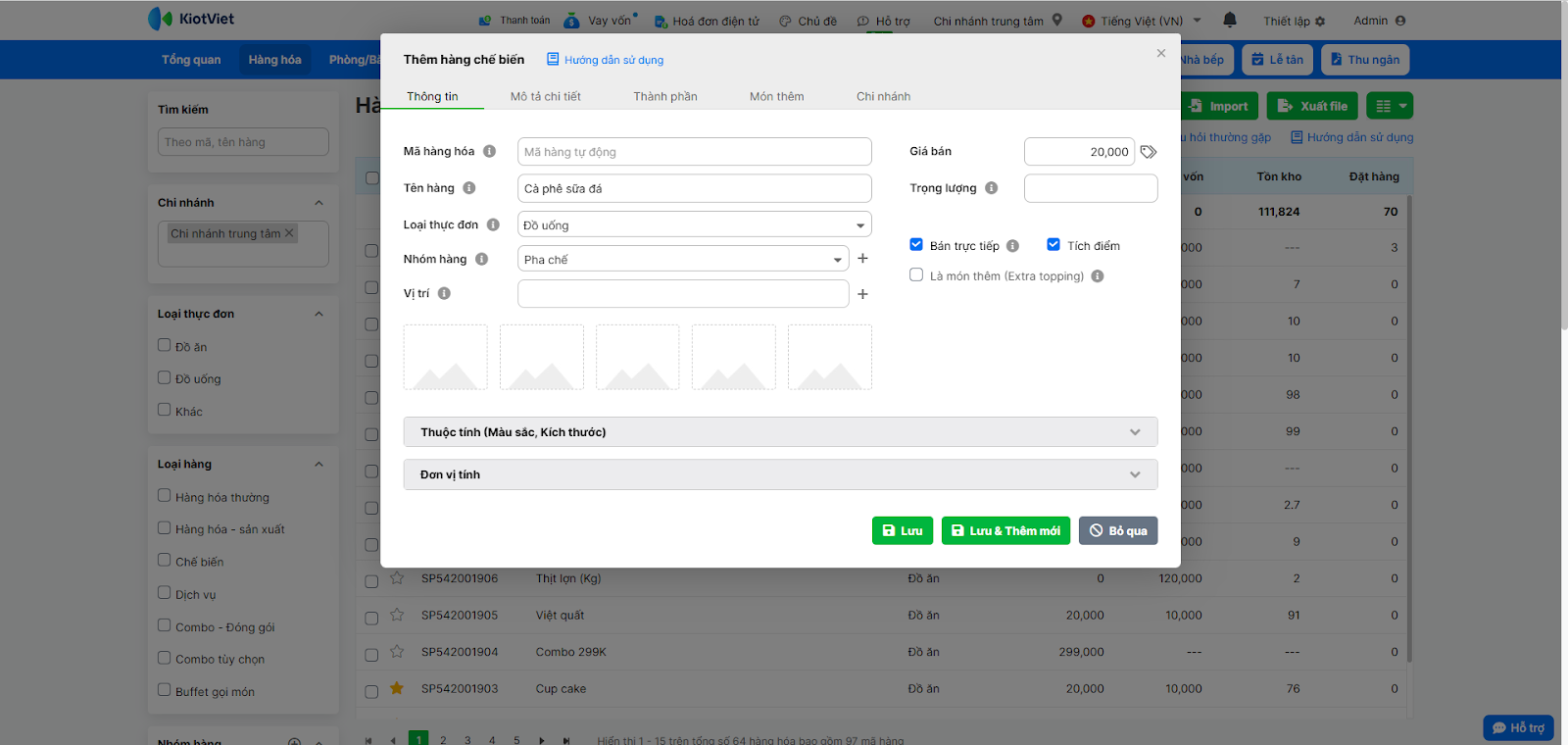 Lưu ý: Hệ thống sẽ không quản lý Tồn kho và Giá vốn của chính món “Cà phê sữa đá”, vì các thông số này được tính toán từ nguyên vật liệu.