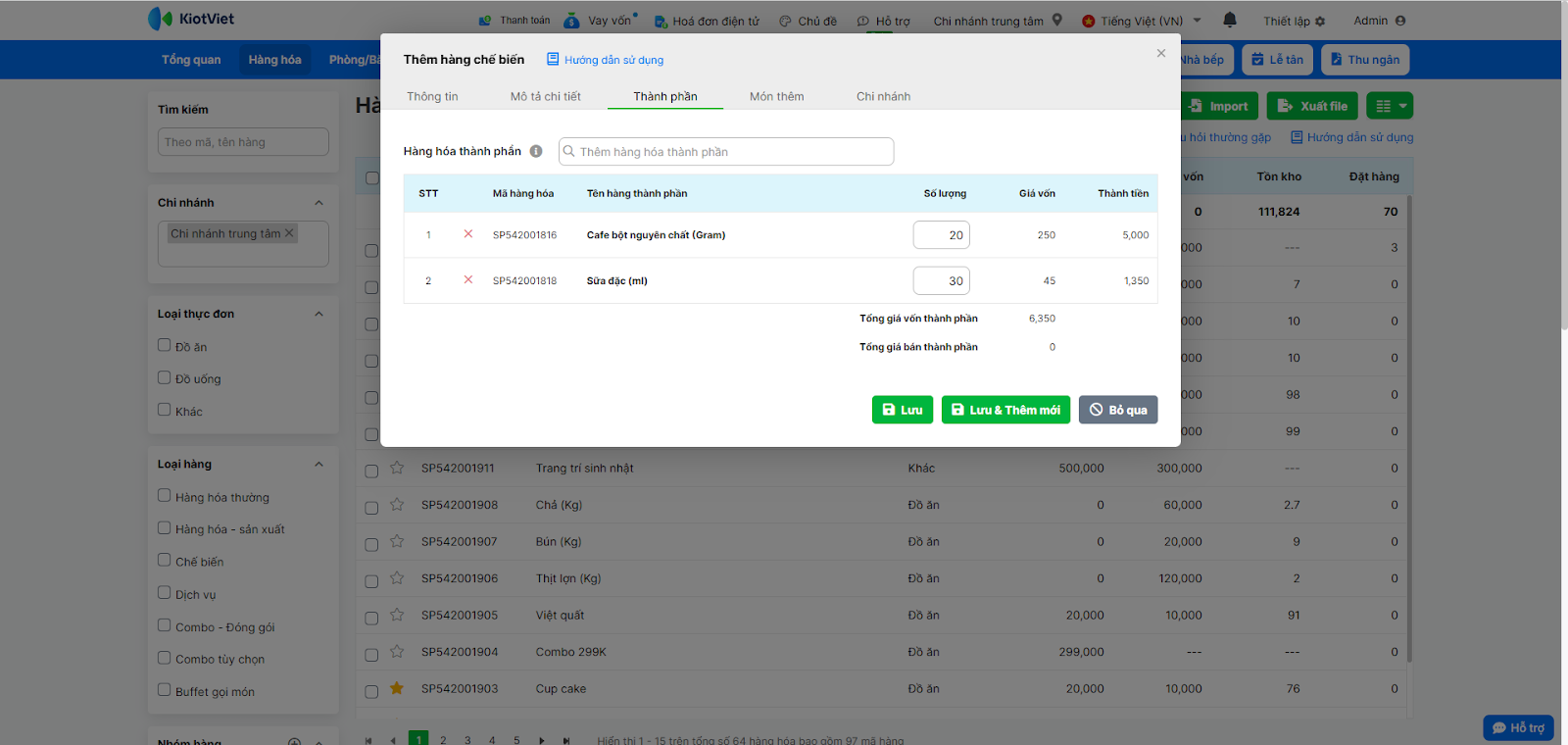 - Tình huống: Bạn cần tạo món “Cà phê sữa đá” trong hệ thống, với công thức định lượng bao gồm “Bột cà phê” (20g) và “Sữa đặc” (30ml).