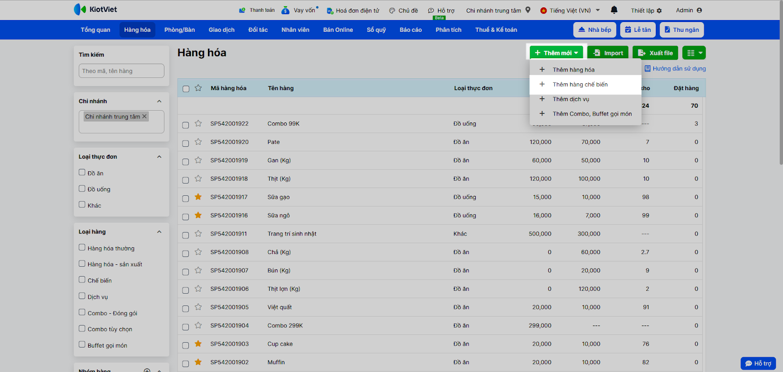 Trên giao diện website quản lý KiotViet, bạn có thể thực hiện đầy đủ các nghiệp vụ để tạo và bán hàng chế biến.