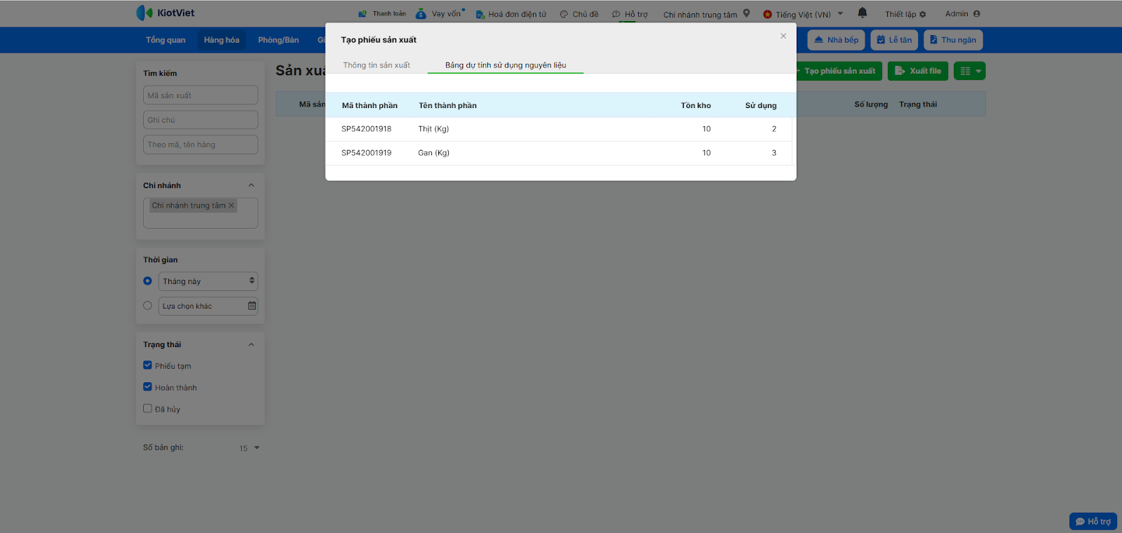 - Hệ thống sẽ tự động hiển thị bảng tính nguyên liệu cần thiết. Nếu NVL trong kho không đủ, hệ thống sẽ cảnh báo bằng số màu đỏ.