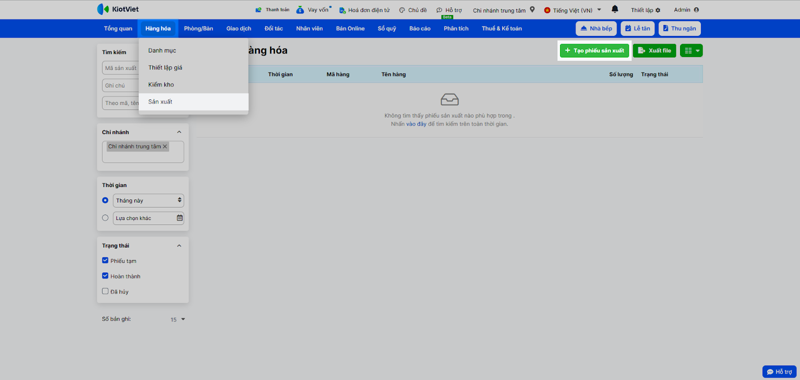 Trên giao diện website quản lý KiotViet, bạn có thể thực hiện đầy đủ các nghiệp vụ để tạo và quản lý phiếu sản xuất.