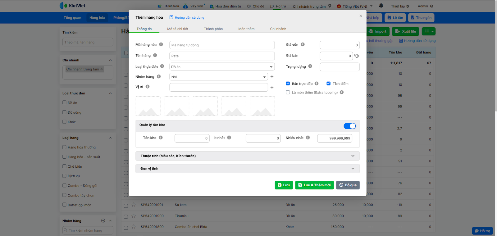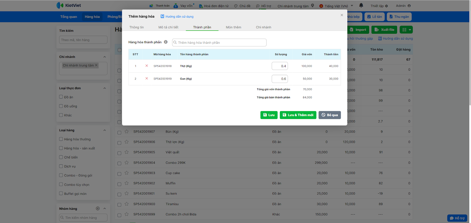 - Tạo một Hàng hóa có thành phần mới trong Hàng hóa → Danh mục → + Thêm mới → Thêm hàng hóa.