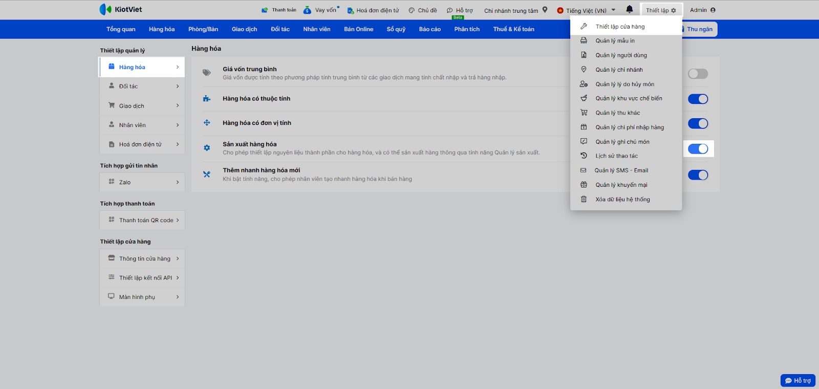 - Trong khối Thiết lập quản lý, bạn chọn Hàng hóa.