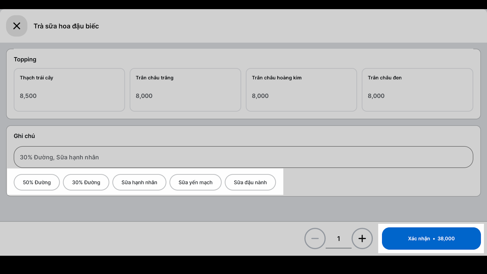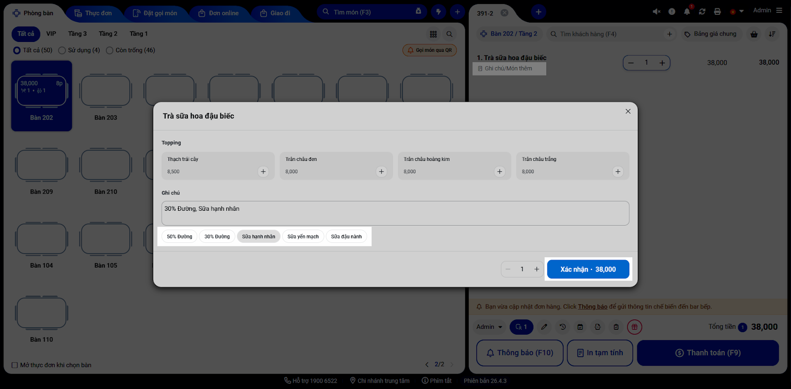 - Chạm Thêm ghi chú món → nhập nội dung ghi chú lẻ (Ví dụ: Ít trà, Đậm trà,…).