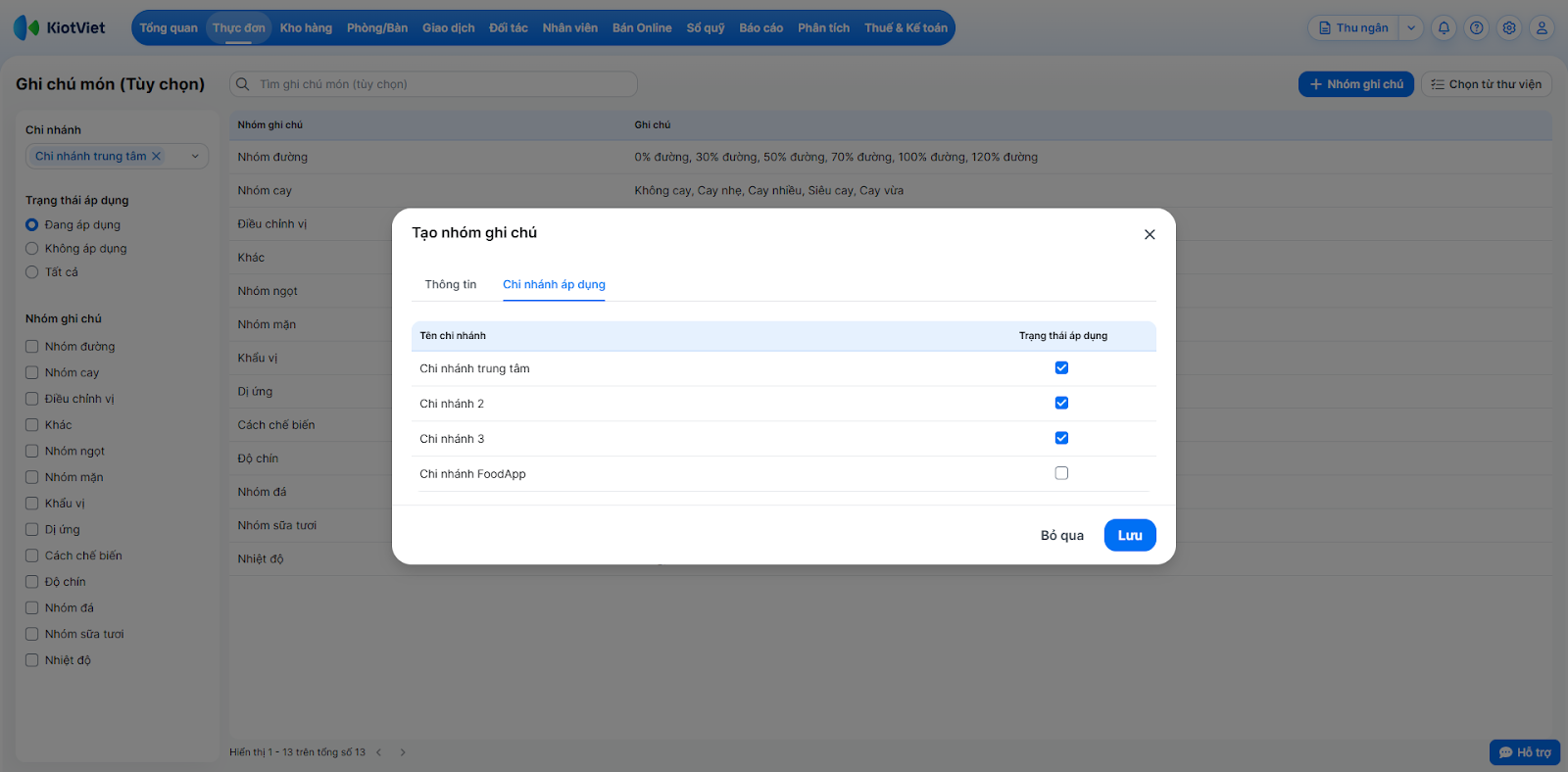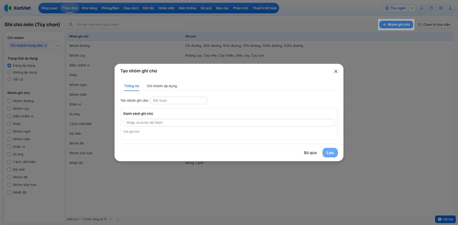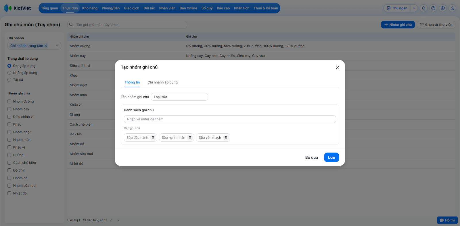 Tình huống: Gian hàng của bạn có những yêu cầu chế biến đặc thù (ví dụ: nhóm độ ngọt, nhóm topping thêm, loại sữa,…) không có sẵn trong thư viện. Bạn cần tự tạo nhóm ghi chú mới và áp dụng cho các chi nhánh cụ thể.